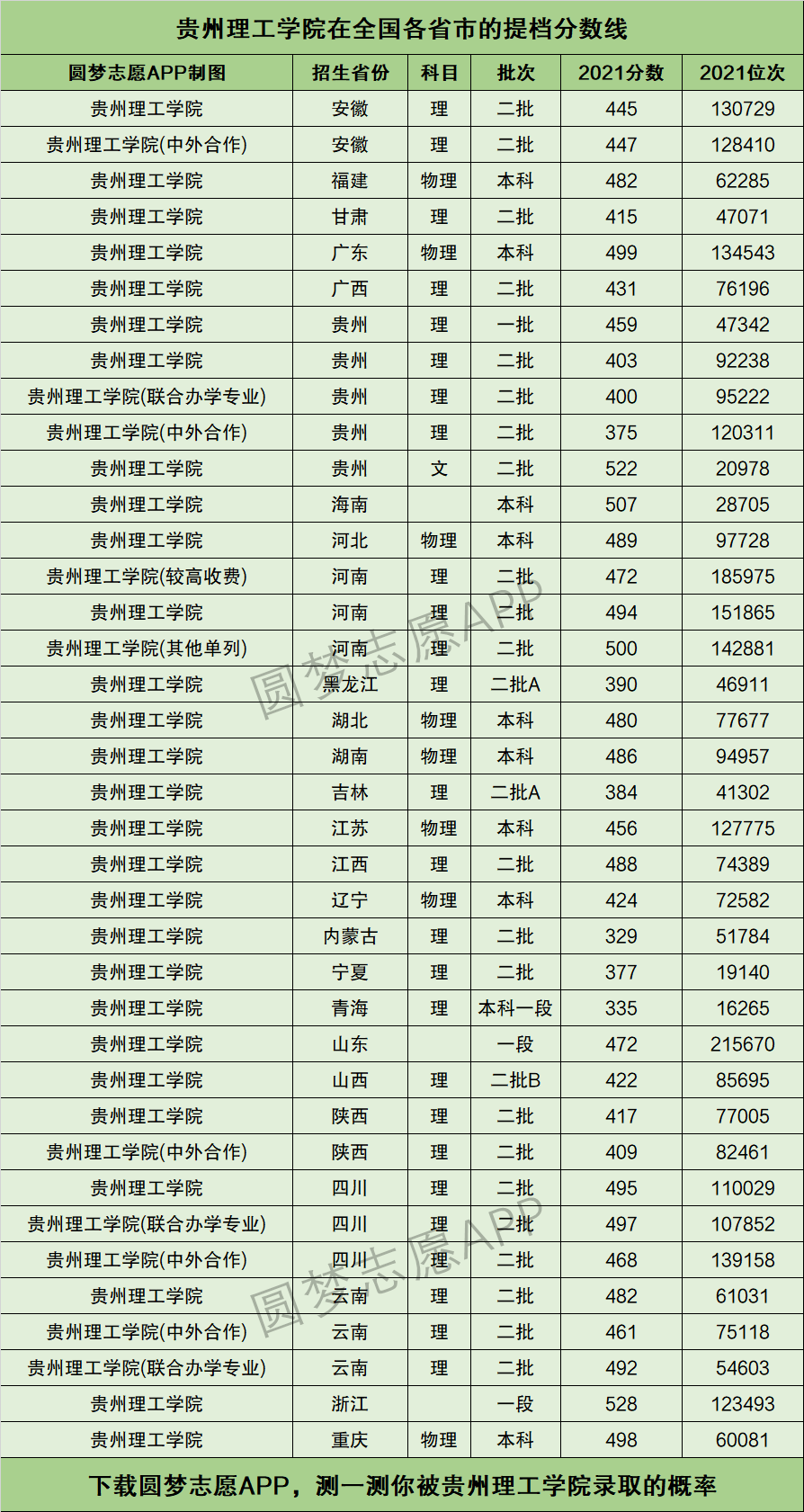 一、贵州理工学院提档线2021年 贵州理工学院位于贵州省贵阳市,所以小编先为大家单独列出了贵州理工学院在贵州省2021年的提档分数线。 1、文科 贵州理工学院在本科二批的最低提档线为522分,最低位次为20978名。 2、理科 贵州理工学院在本科一批的最低提档线为459分,最低位次为47342名。 贵州理工学院在本科二批的最低提档线为403分,最低位次为92238名。 贵州理工学院(联合办学专业)在本科二批的最低提档线为400分,最低位次为95222名。 贵州理工学院(中外合作)在本科二批的最低提档线为375分,最低位次为120311名。 如果你想查看:贵州理工学院各专业——近三年的录取分数线和位次。请直接在手机应用市场下载圆梦志愿APP,获取资料。 二、贵州理工学院调档比例 本文将以贵州理工学院2021年本科招生章程为依据,为大家提供贵州理工学院的调档比例。 学校根据各省(自治区、直辖市)生源情况确定提档比例,投档比例一般控制在招生计划的100%至105%之间,并按照各省(自治区、直辖市)规定的投档比例执行。 三、贵州理工学院在全国各省市的提档线汇总 下图为具体的招录数据,同学们在参考时一定不能只看贵州理工学院的最低分,要重点对比贵州理工学院的最低录取位次↓