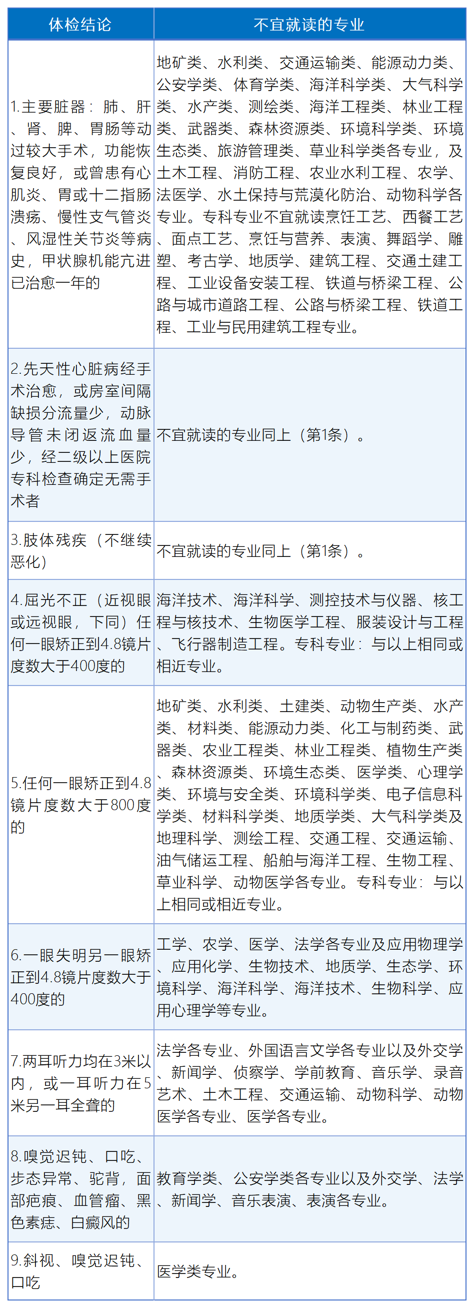 高考体检病例与限报专业对照表如下: