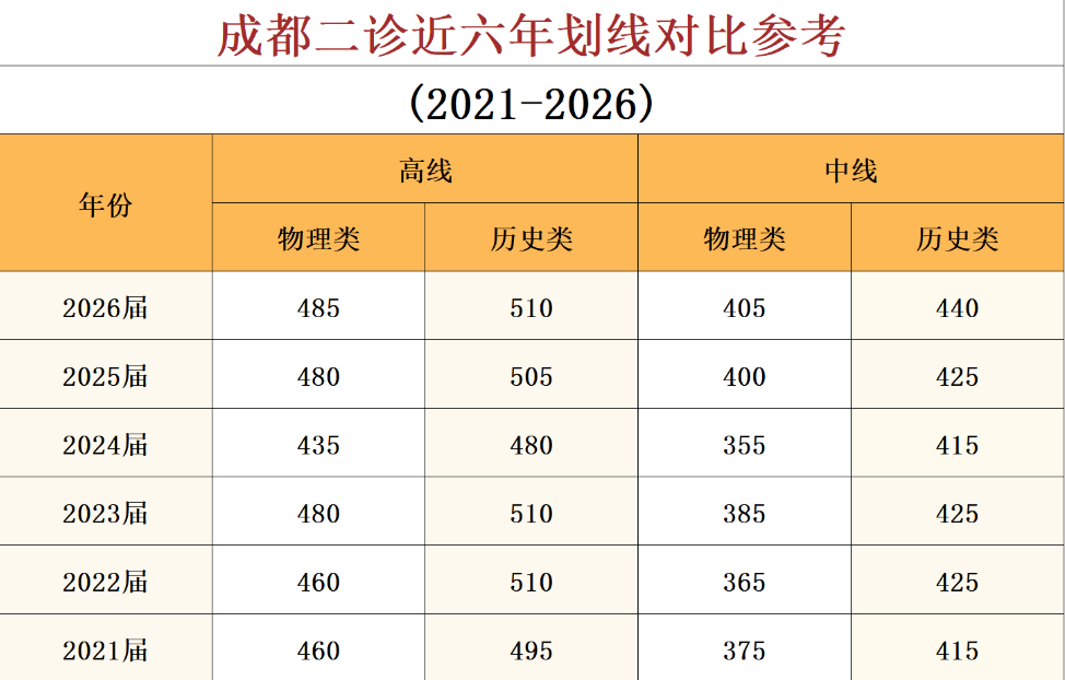 从近六年成都二诊划线变化来看(2021-2026年),物理类高线在2024年出现一个低谷(435分),随后在2025年回升至480分,2026年继续微涨至485分,显示物理类考生整体竞争水平有所回升。
