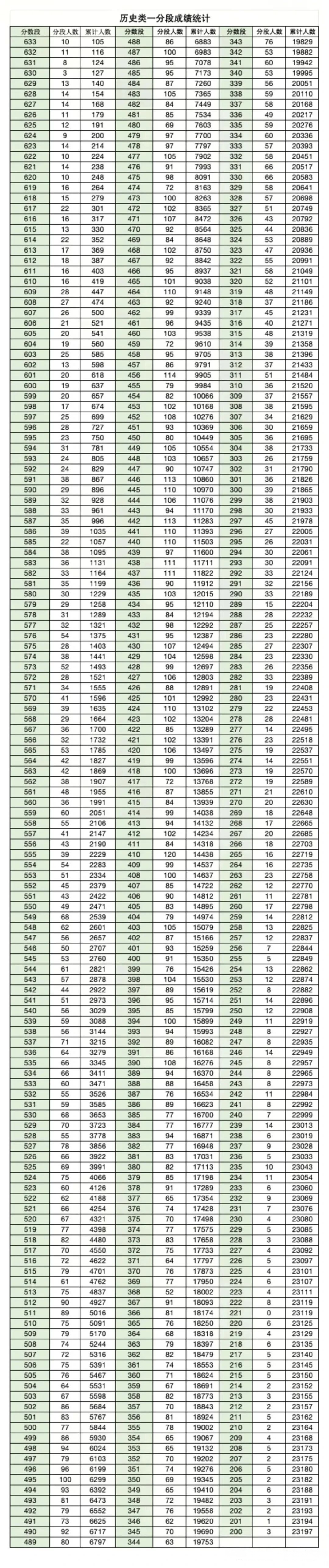 历史类:高分段人数相对较少,633分以上累计105人,600分以上累计605人。随着分数下降,人数逐步增多,在510分(高线)附近,累计人数达到4490人;在440分(中线)附近,累计人数达到7290人。从整体分布看,历史类考生人数少于物理类,且分数段分布更为集中。