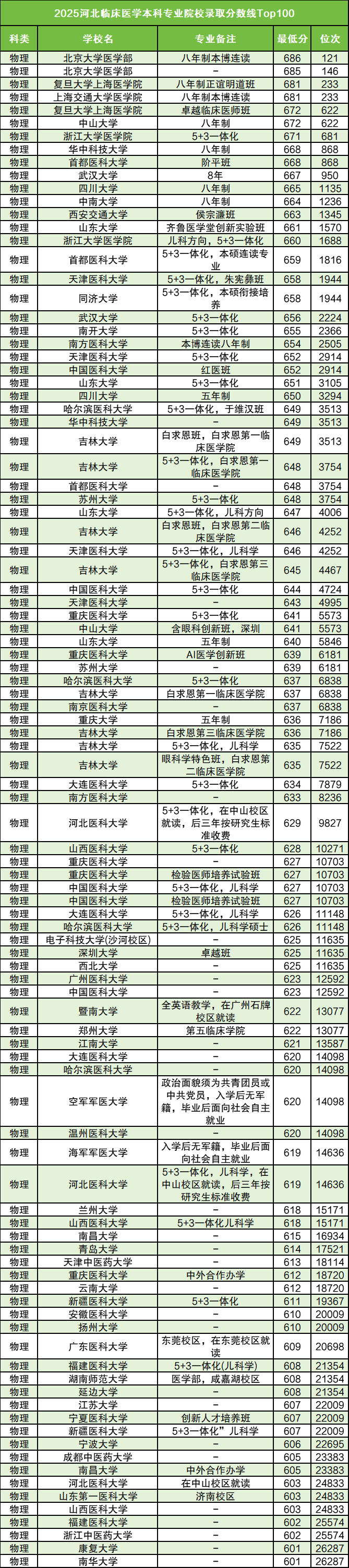 1、北京大学医学部:临床医学(八年制本博连读)686分、物理类位次121名;
