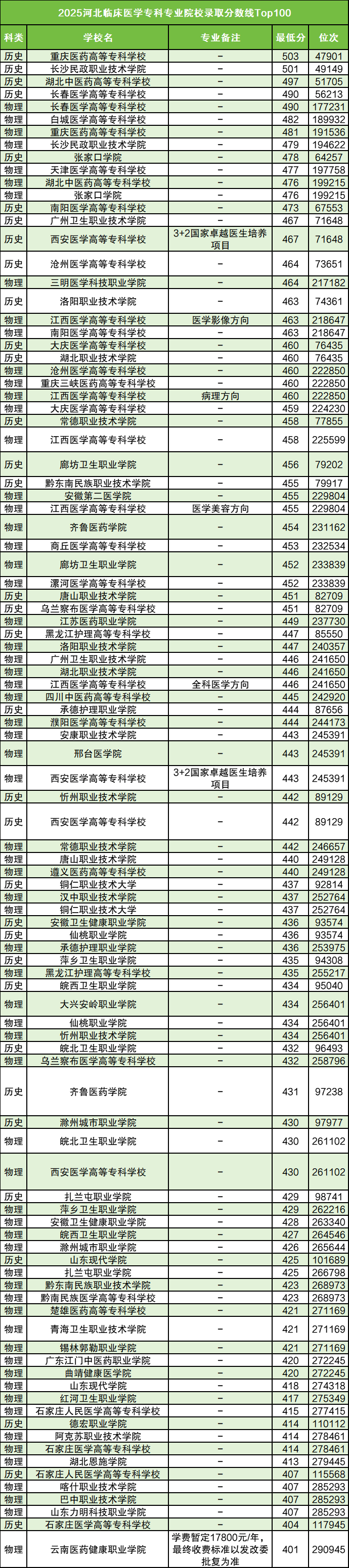 下面是临床医学专科专业各校录取分数线一览表(Top100):