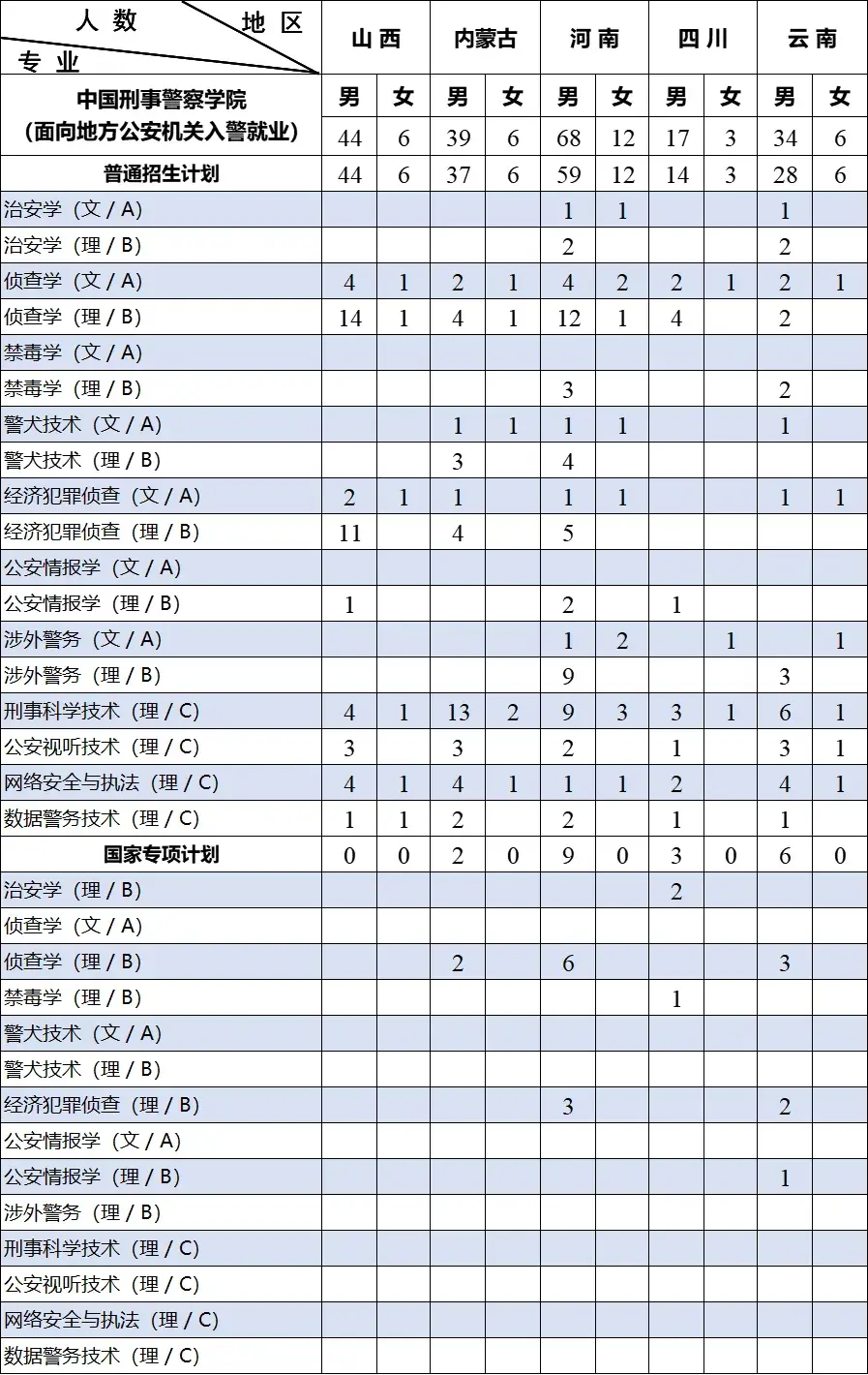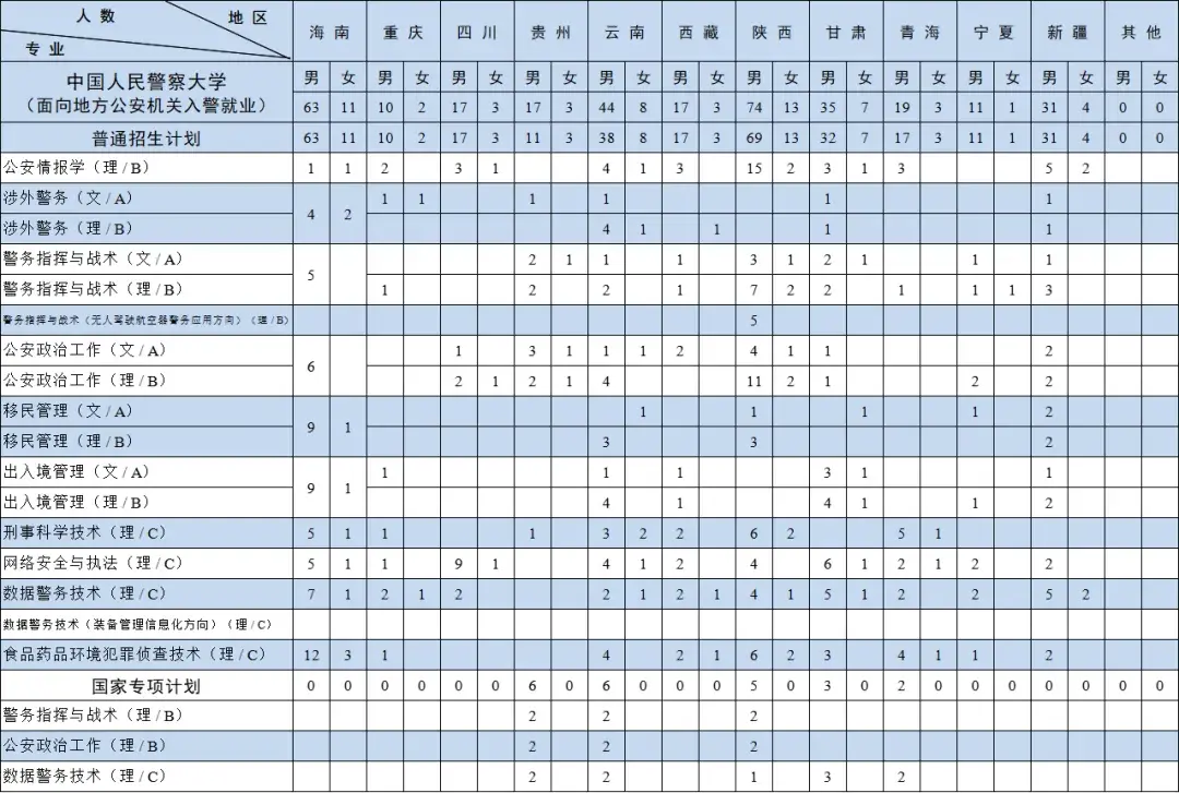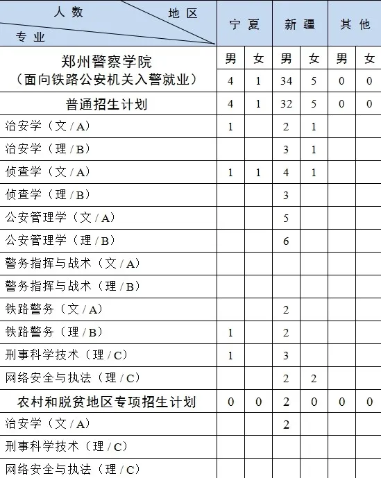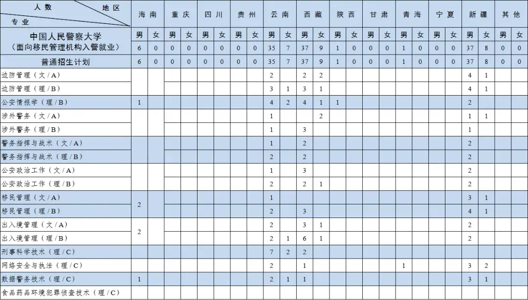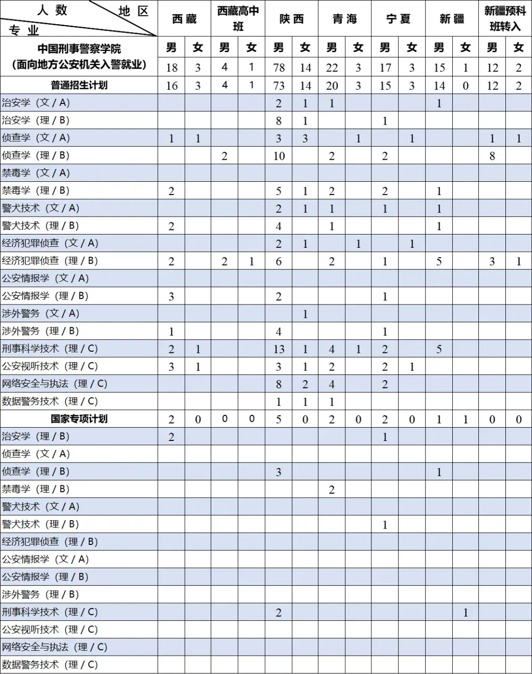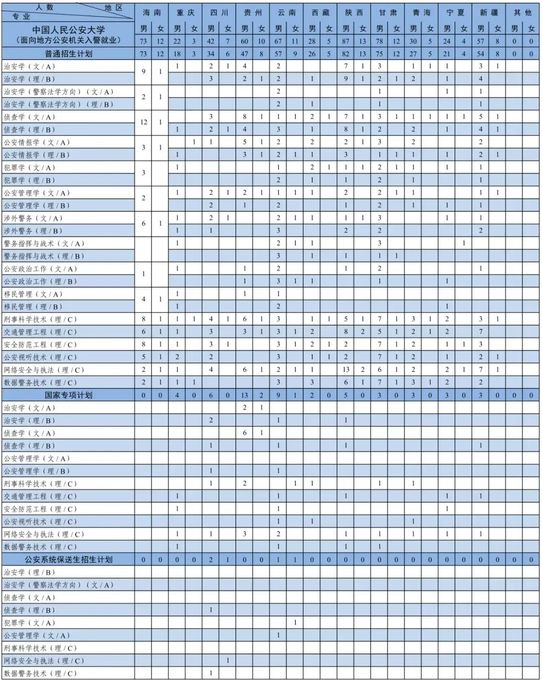 (1)新疆计划中含新疆协作计划转入 6人,均为男生 ,具体为治安学(文)2人、侦查学(理)2人、公安管理学(理)2人。