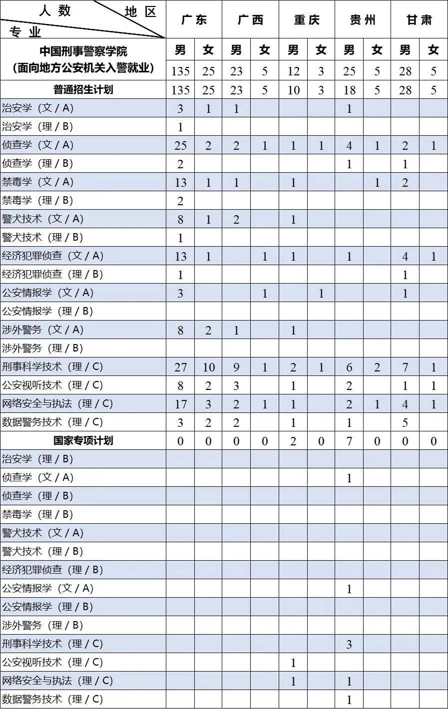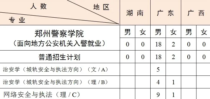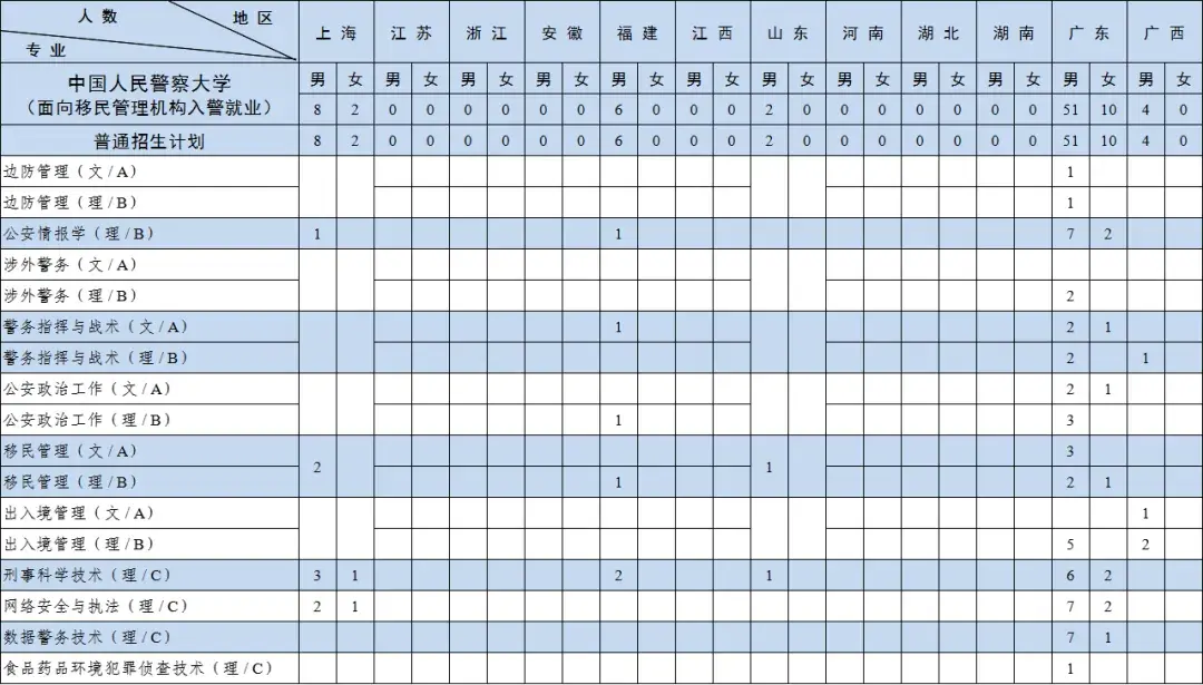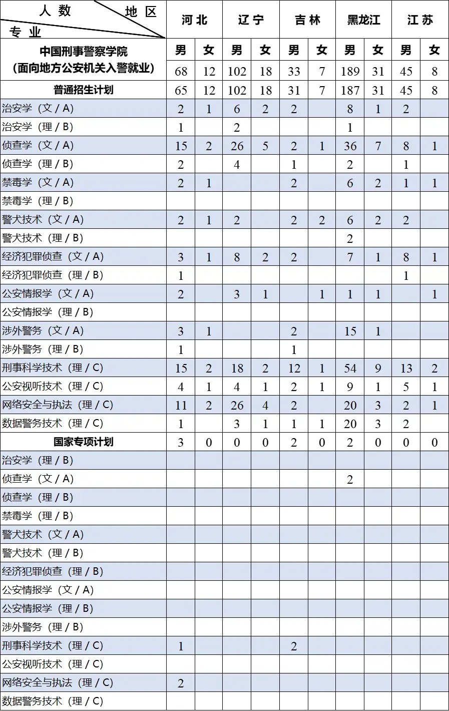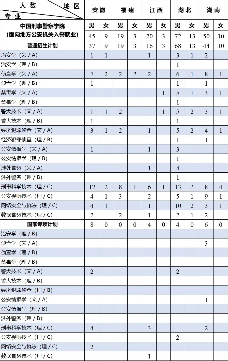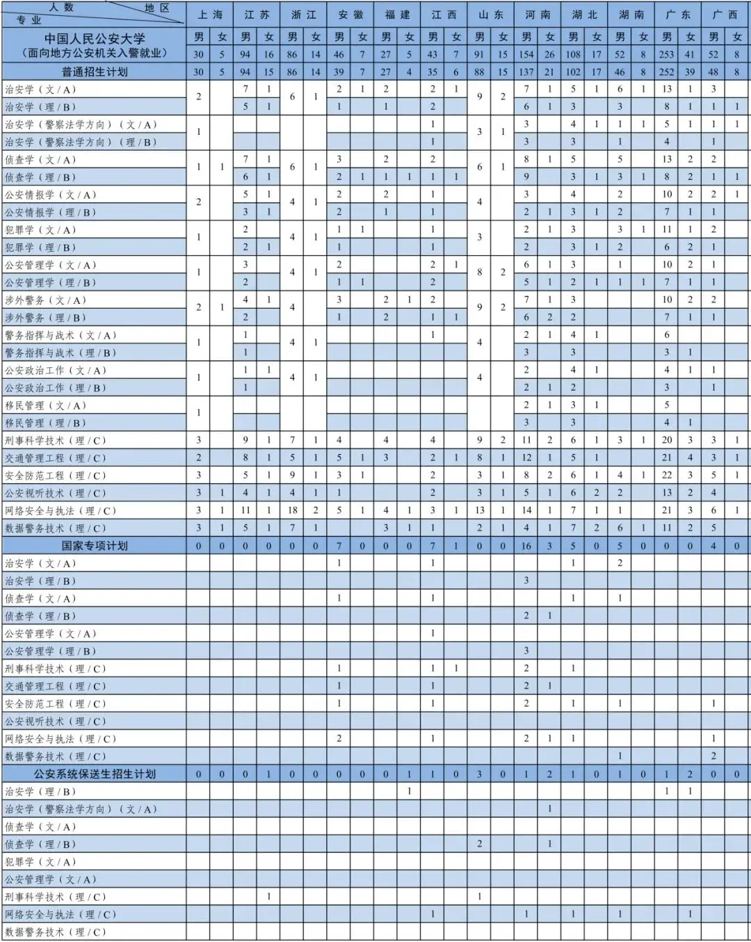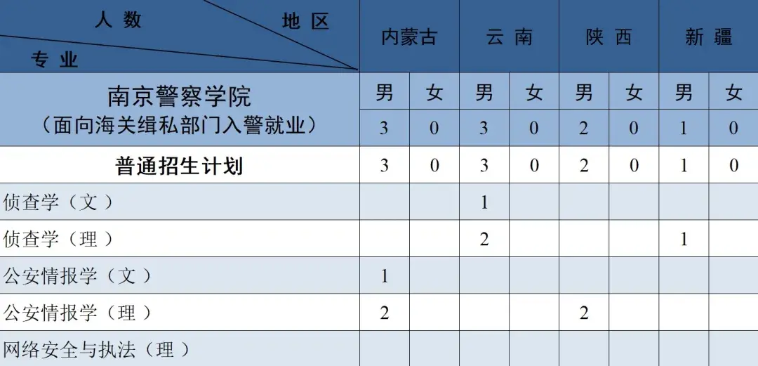 (1)新疆计划中含新疆协作计划转入 6人,均为男生 ,具体为治安学(文)2人、侦查学(理)2人、公安管理学(理)2人。