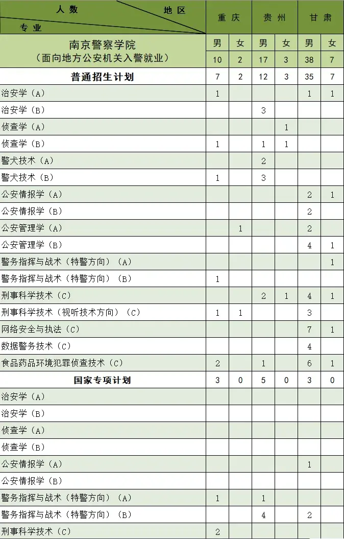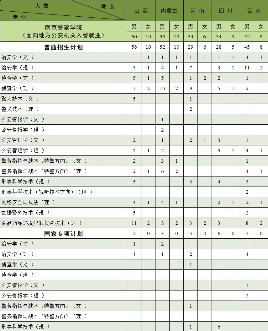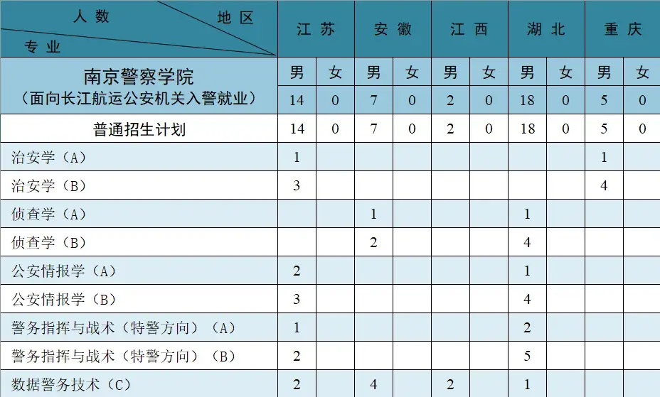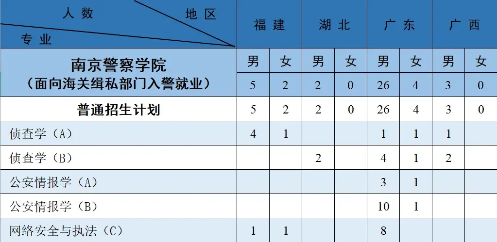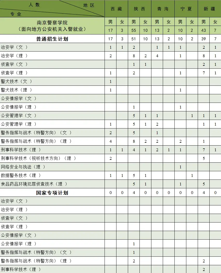 西藏计划中含西藏高中班计划 5 人。其中:男生 4 人,具体为侦查学(理)2 人、经济犯罪侦查(理)2 人;女生 1 人,具体为经济犯罪侦查(理)1 人。