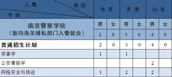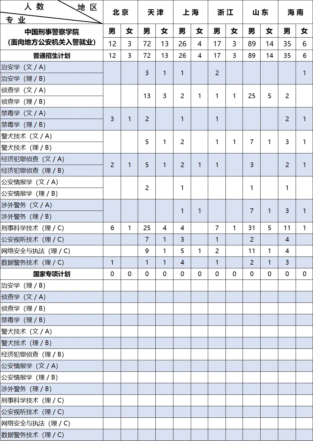 在北京、天津、上海、浙江、山东、海南 6 个省(市),招生计划不分文科、理科和 A 类、B 类、C 类。其中,报考公安学类专业招生计划要求必选政治,报考公安技术类专业招生计划要求必选物理和化学。