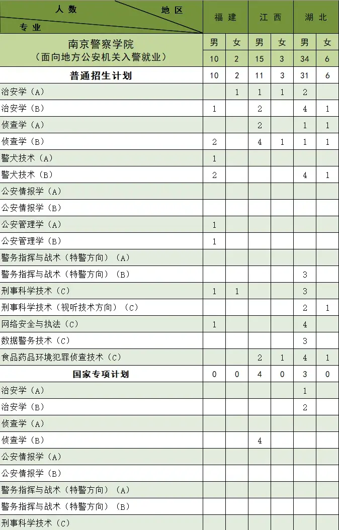 在河北、辽宁、吉林、黑龙江、江苏、安徽、福建、江西、湖北、湖南、广东、广西、重庆、贵州、甘肃 15 个省(区、市),招生计划分为 A 类、B 类、C 类。其中,报考A 类招生计划要求首选科目为历史,再选科目必选政治;报考B 类招生计划要求首选科目为物理,再选科目必选政治;报考C 类招生计划要求首选科目为物理,再选科目必选化学。