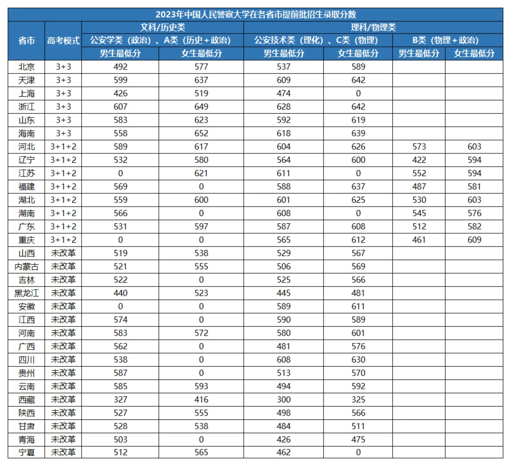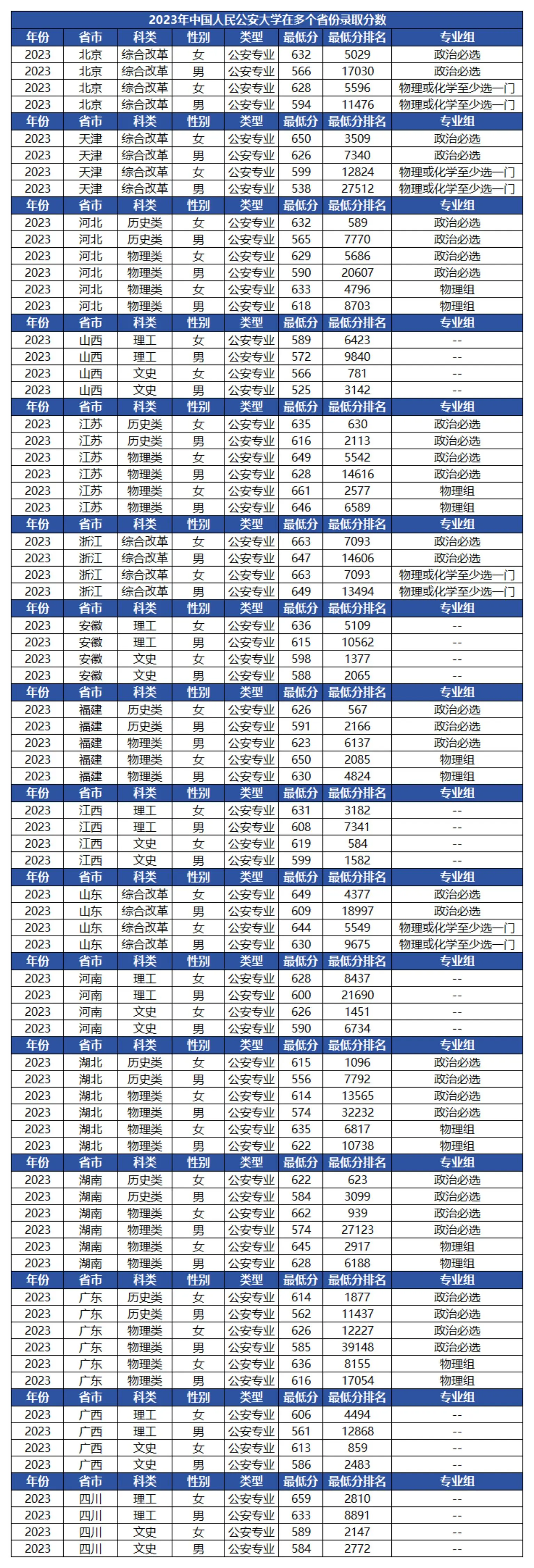 下文为大家整理了2023年中国人民公安大学提前批公安专业在多个省份的录取分数,供参考。