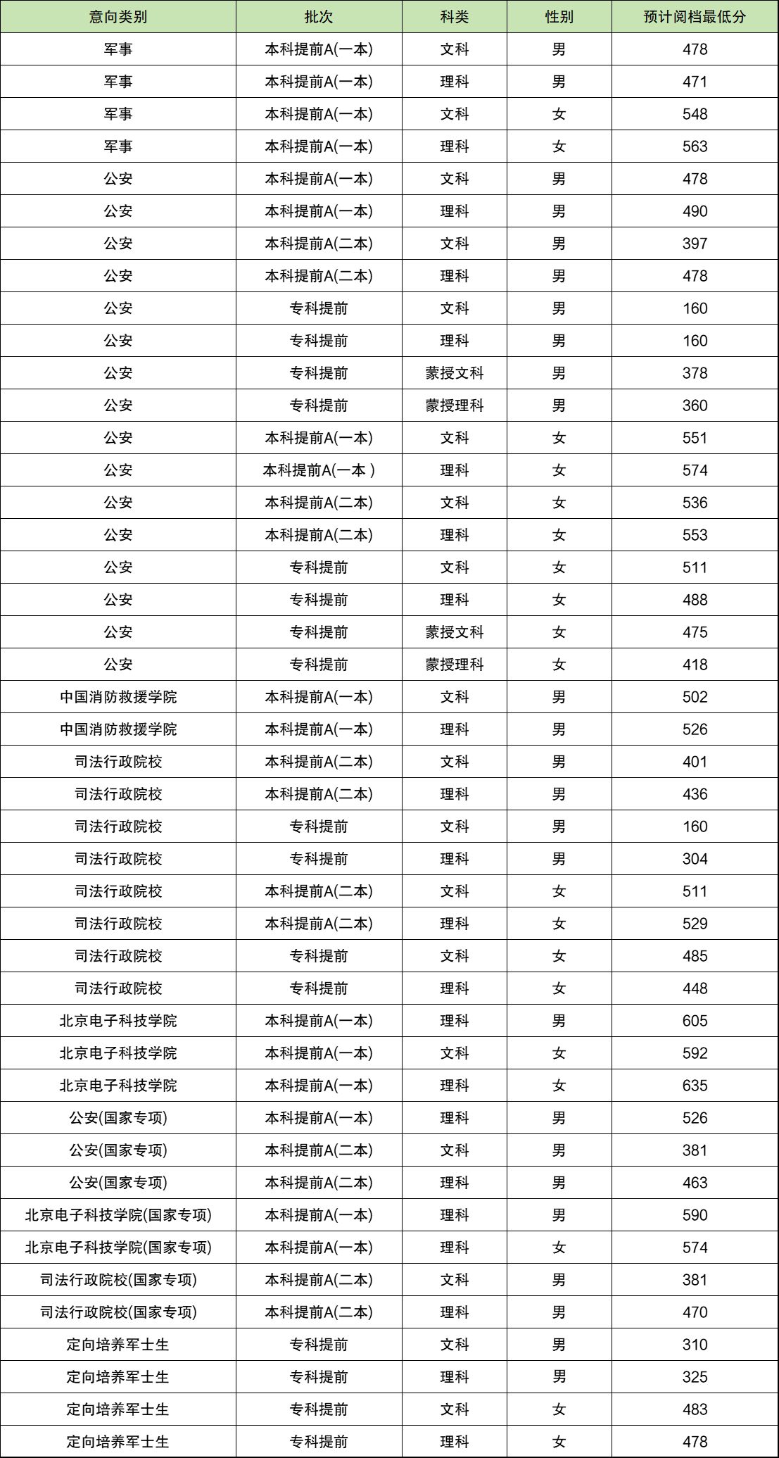 定向培养军士生院校只在专科提前批招生,分性别进行录取,最低投档分数线是: