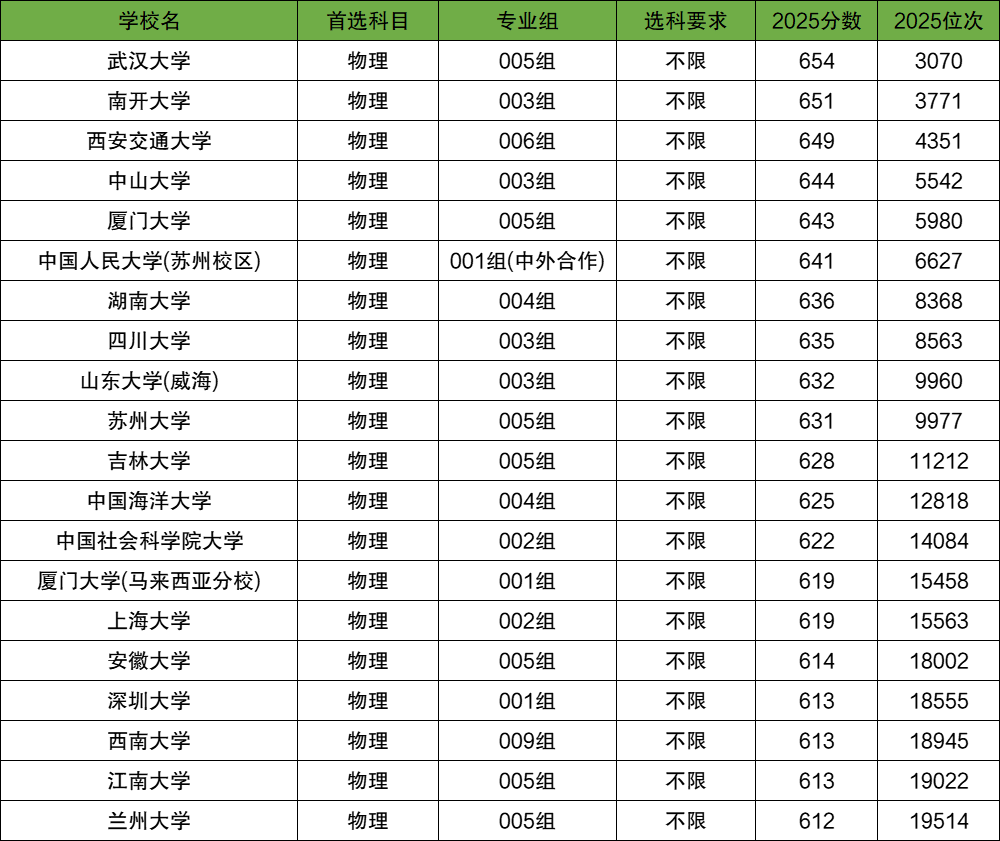 物生政可以报考的综合类大学中,最好的是武汉大学005组,2025最低分654分;分数线最高的前五名还有南开大学003组(651分)、西安交通大学006组(649分)、中山大学003组(644分)、厦门大学005组(643分)。