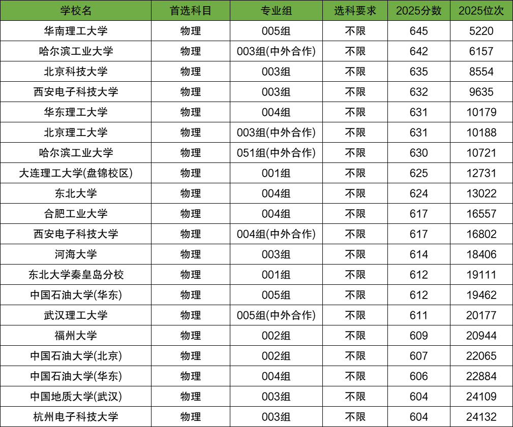物生政可以报考的理工类大学中,最好的是华南理工大学005组,2025最低分645分;分数线最高的前五名还有哈尔滨工业大学003组(中外合作)(642分)、北京科技大学003组(635分)、西安电子科技大学003组(632分)、华东理工大学004组(631分)。