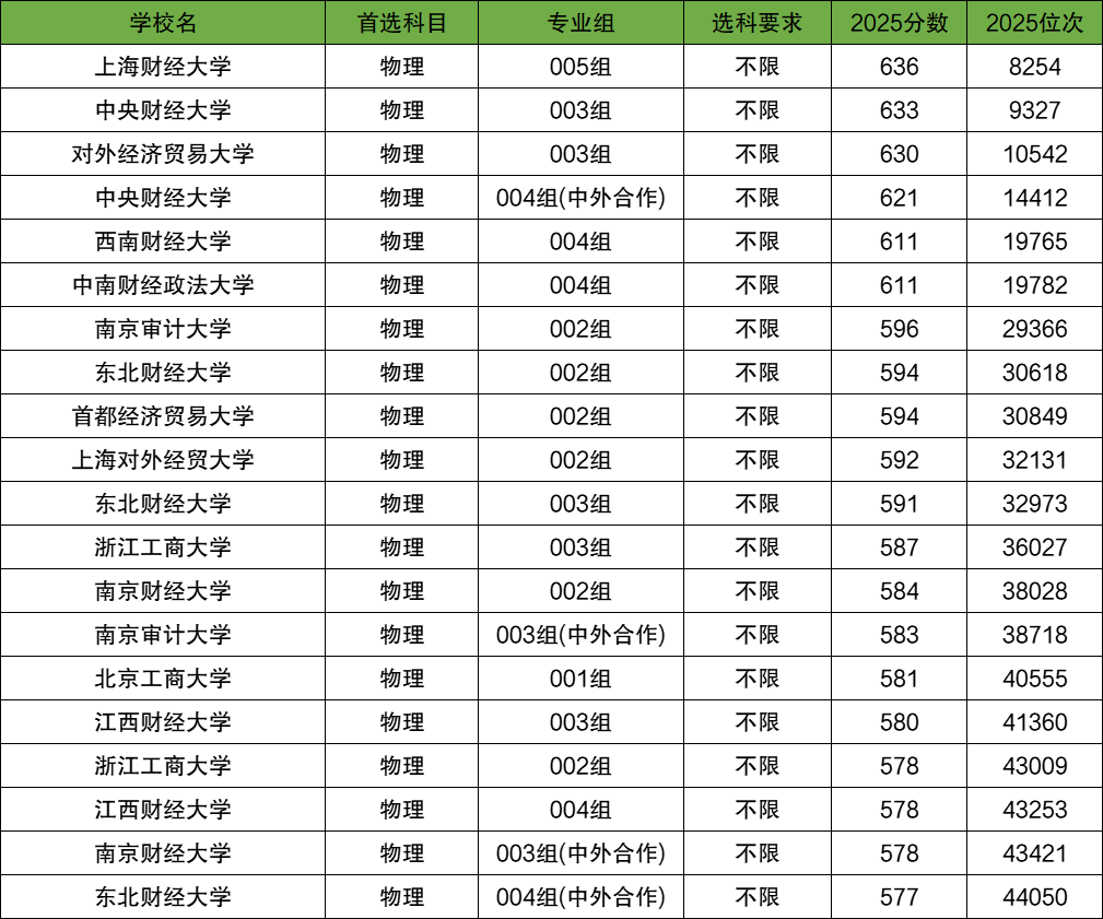 物生政可以报考的财经类大学中,最好的是上海财经大学005组,2025最低分636分;分数线最高的前五名还有中央财经大学003组(633分)、对外经济贸易大学003组(630分)、中央财经大学004组(中外合作)(621分)、西南财经大学004组(611分)。