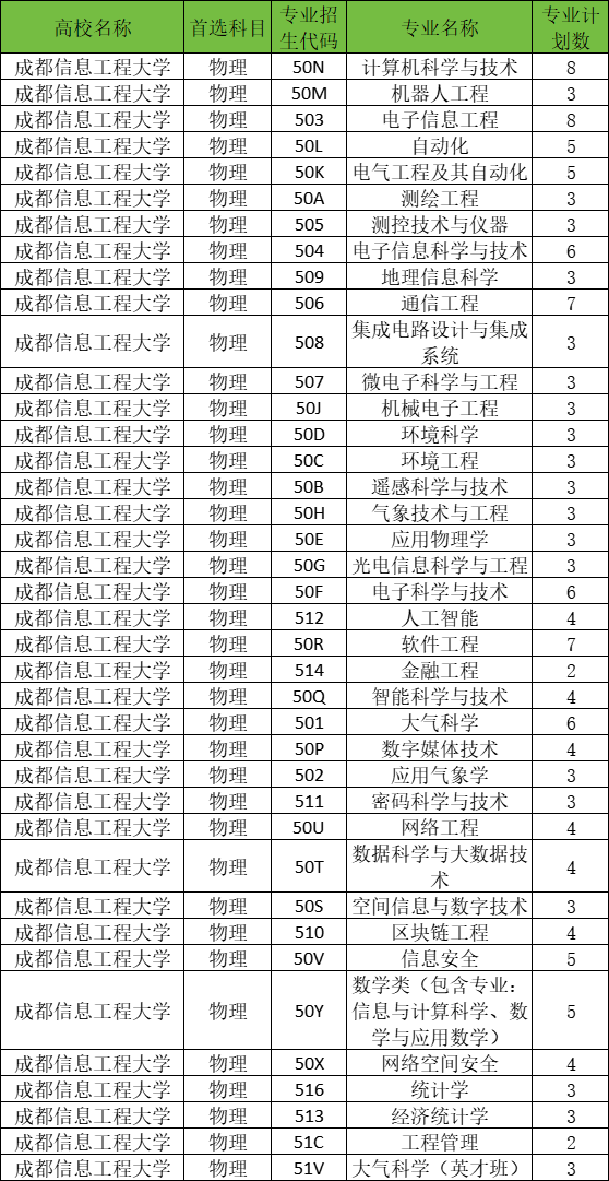 如2025在重庆普通类本科批招生院校中,成都信息工程大学物理类招生人数为157人,招生专业有计算机科学与技术、机器人工程、电子信息工程、自动化、电气工程及其自动化等专业,院校招生代码为5108。