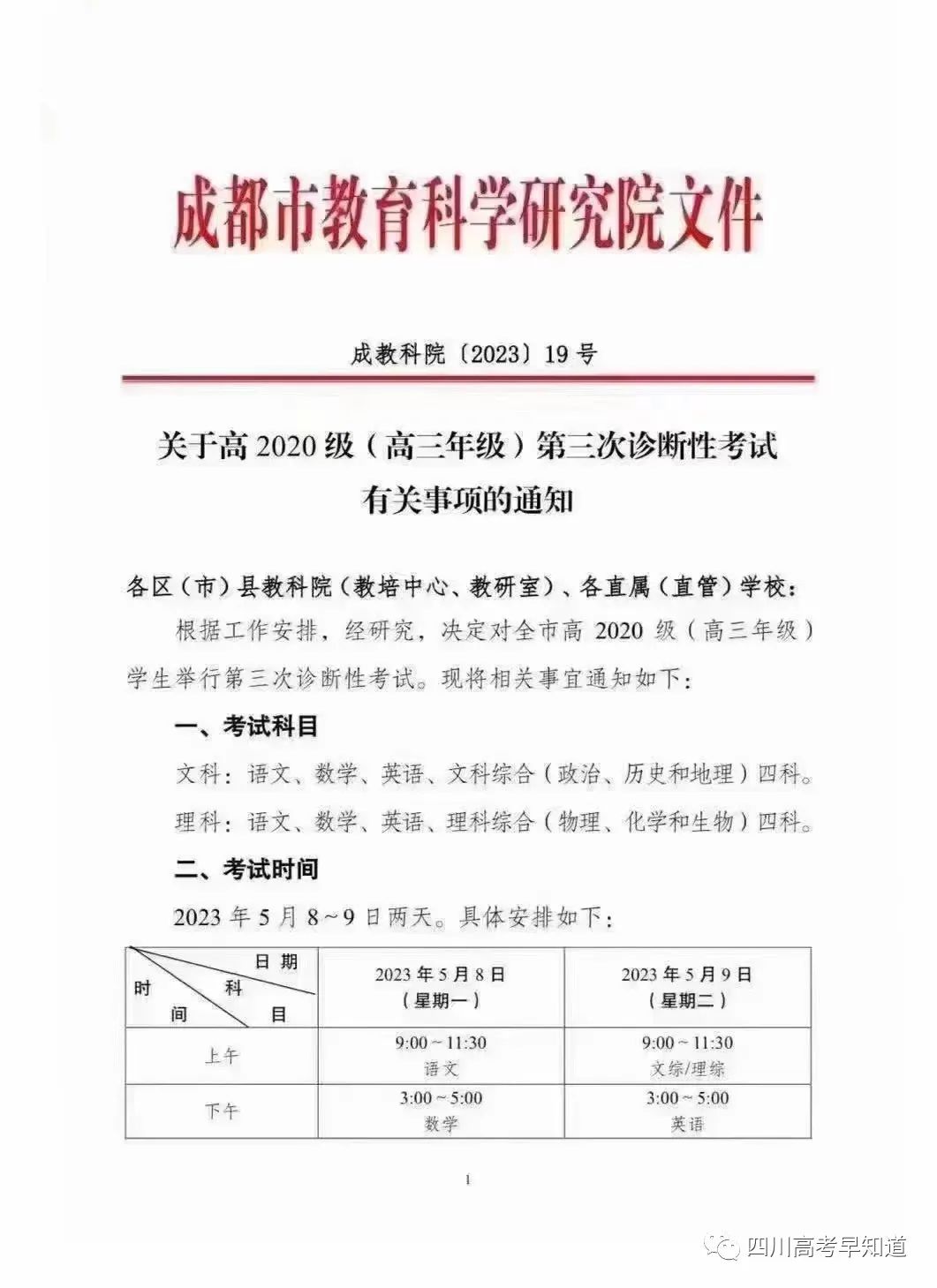 2023年成都高三三诊考试时间是5月8日至5月9日,为期两天,考试科目有语文、数学、英语、文综、理综。