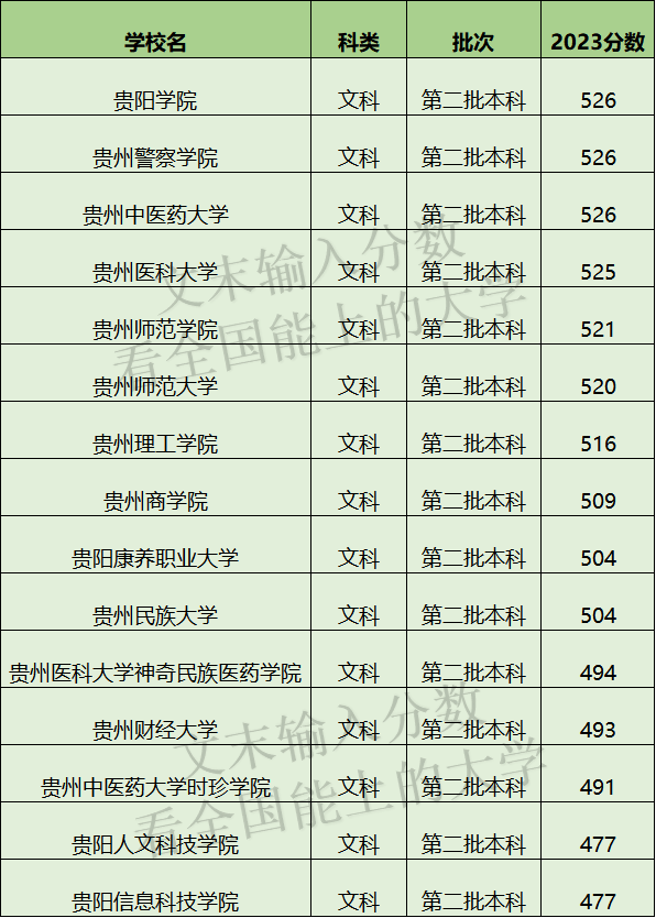 在贵阳市文科中,贵阳市所有二本大学分数最高最难考的大学为贵阳学院、贵州警察学院、贵州中医药大学、贵州医科大学、贵州师范学院,对应最低分数为526分、526分、526分、525分、521分。