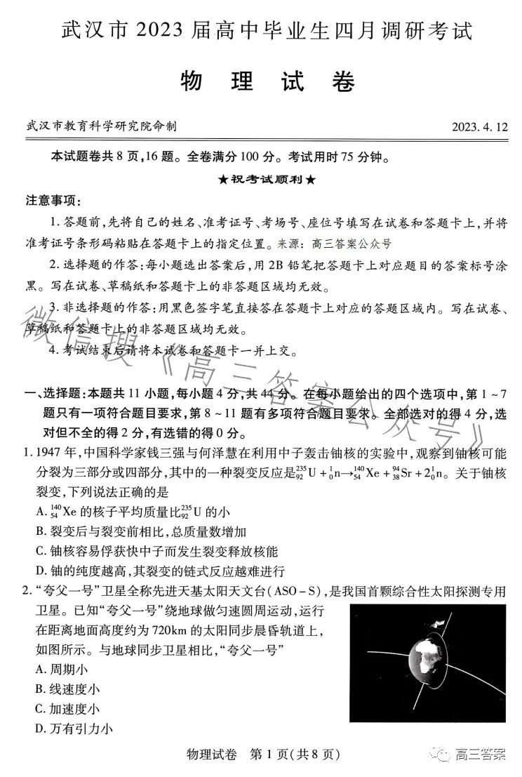 2023武汉四月调考是武汉市较为重要的考试,武汉2023年四调将在4月11日举行,考试结束后,同学们应该都很关注2023武汉高三四月调考各科的答案,本期将整理2023武汉四月调考物理真题及参考答案,希望同学们通过这份资料,及时知晓物理成绩!