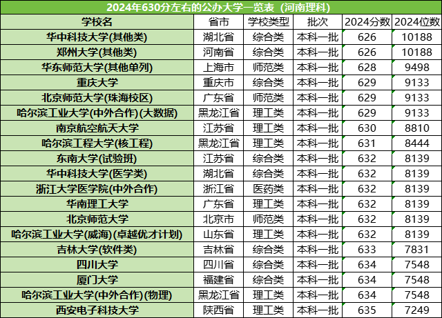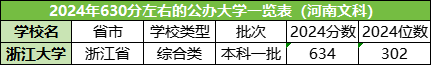 630分左右能上的院校有1所,是一本院校,且是一所实力较强的综合类院校,浙江大学2024年录取分数线为634分。