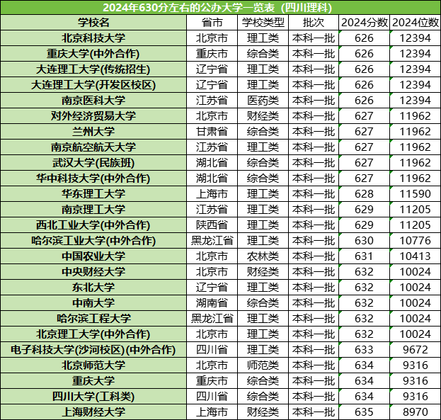 以四川2024年的招生数据为例,在理科方面,630分左右的院校有上海财经大学、四川大学(工科类)、重庆大学、北京师范大学、电子科技大学(沙河校区)(中外合作)、北京理工大学(中外合作)、哈尔滨工程大学、中南大学、东北大学、中央财经大学等。关于其余省市630分左右能上的院校,详见下文。