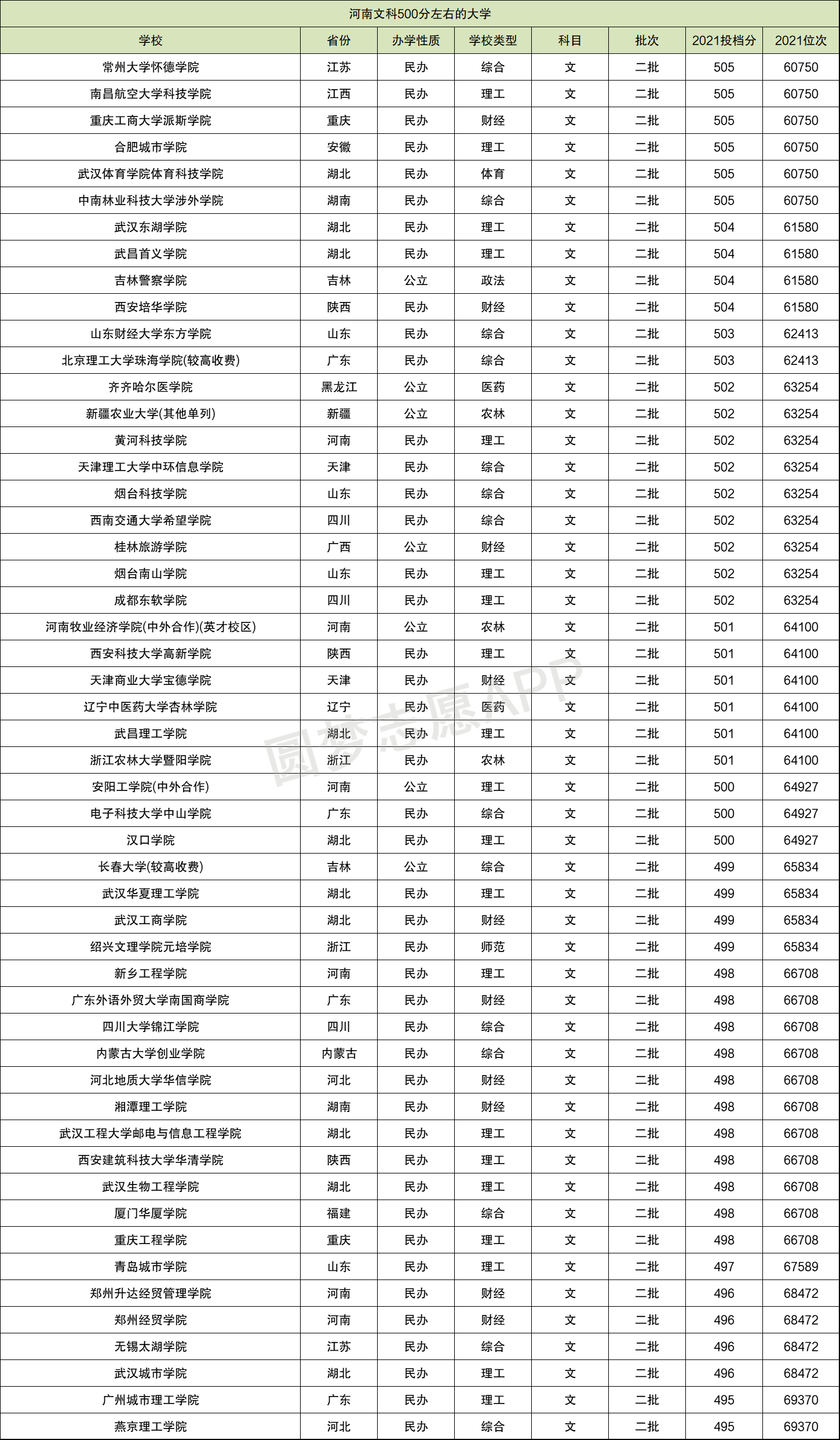 2021年河南实行的是旧高考模式,所以分数线的整理是按照文理分科进行整理的,小编就分别为大家整理出河南文科和理科500分左右的大学,供大家参考。