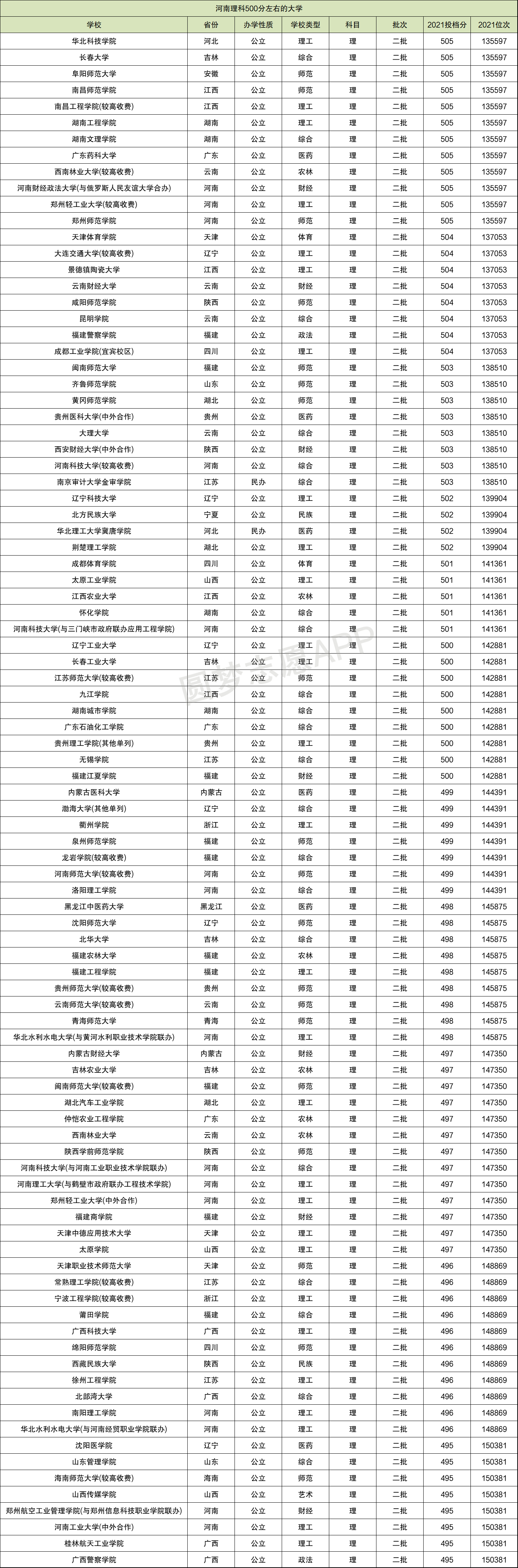 由于每所院校在每个省份的录取情况都不一样,所以最后形成的录取分数线自然也不相同,小编就以河南和河北为例,根据河南和河北教育考试院公布的2021年招录数据,为大家整理出河南和河北500分左右的大学,供2022年考生参考。