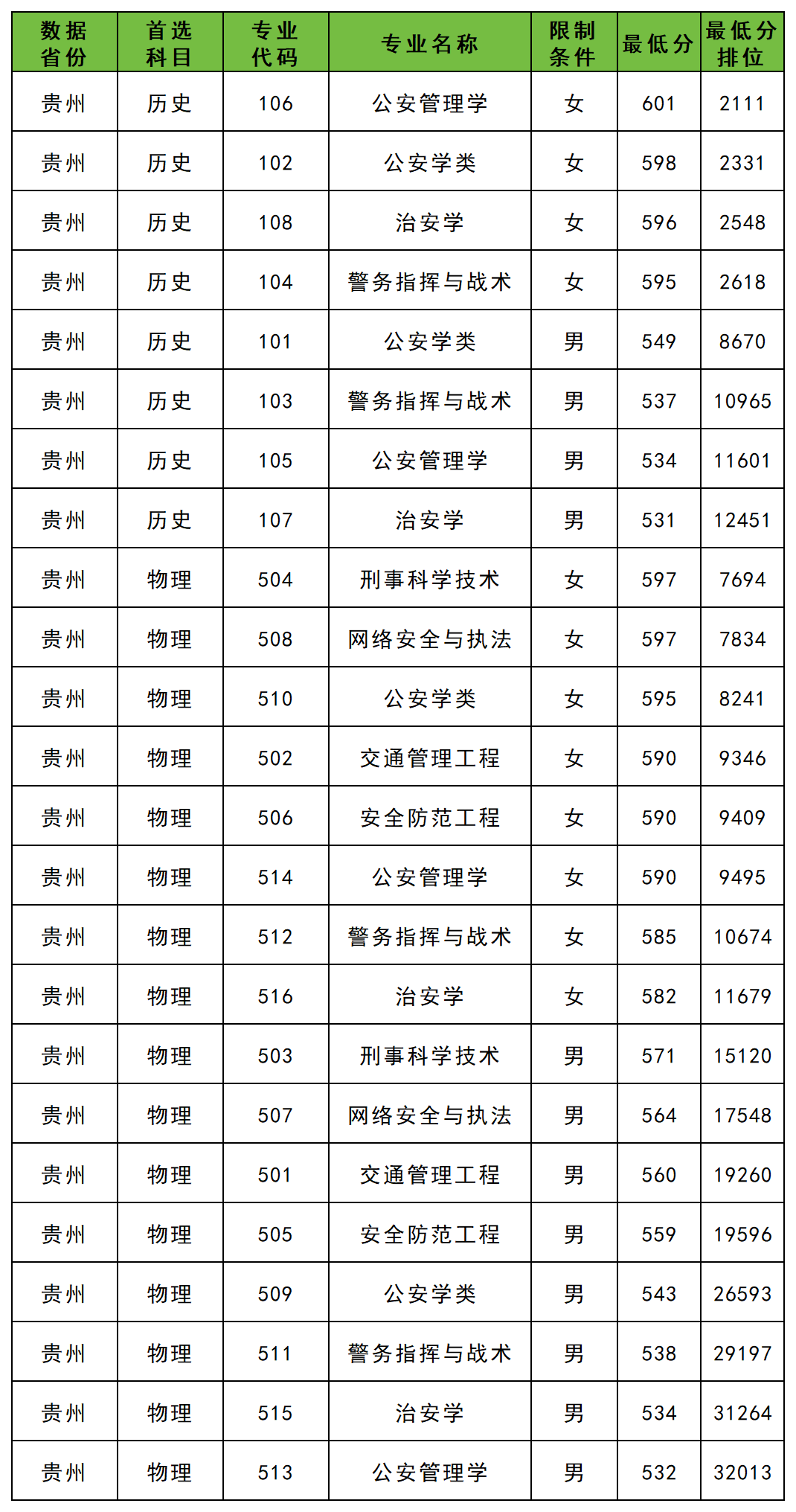 在贵州,贵州警察学院录取最低分是531分,但这只是历史类男生的最低分,如果是物理类男生的话最低分可达532分,如果是物理类女生的话,最低分高达582分。