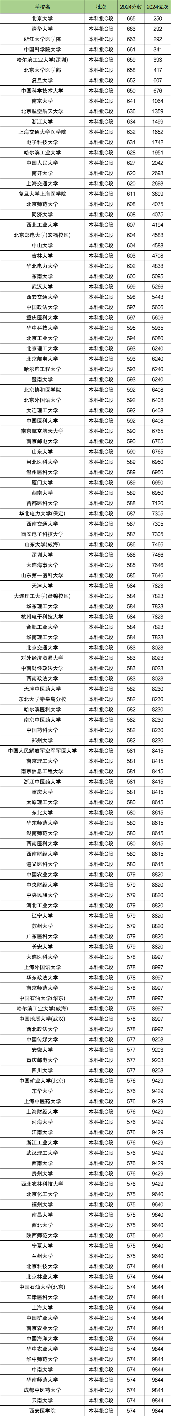 收分最低的是华中师范大学、中南大学、华南师范大学、成都中医药大学、云南大学、西安医学院,全省录取位次为9844位,对应分数为574分。