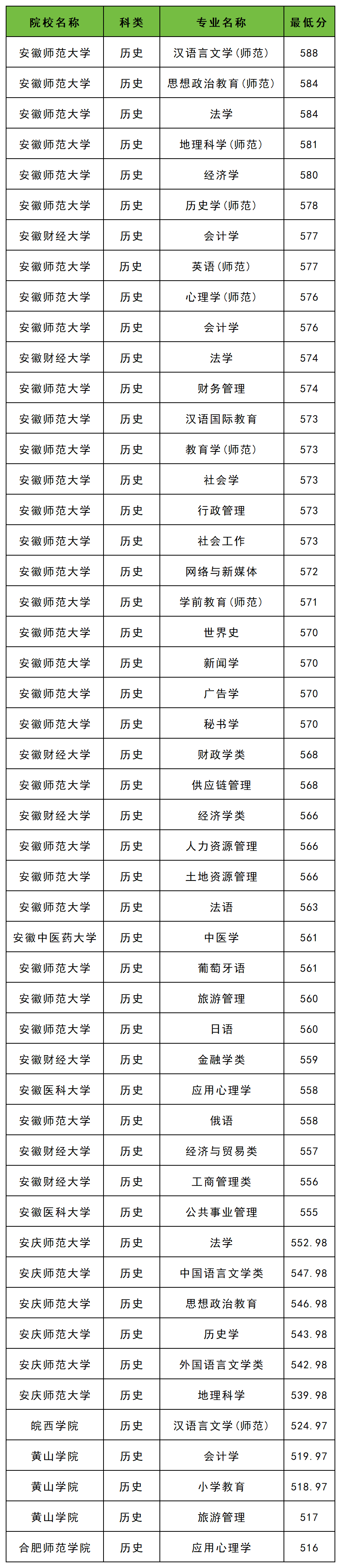 2025年安徽地方专项历史类录取分数线位于516分到588分之间,各学校各专业最低分如下。