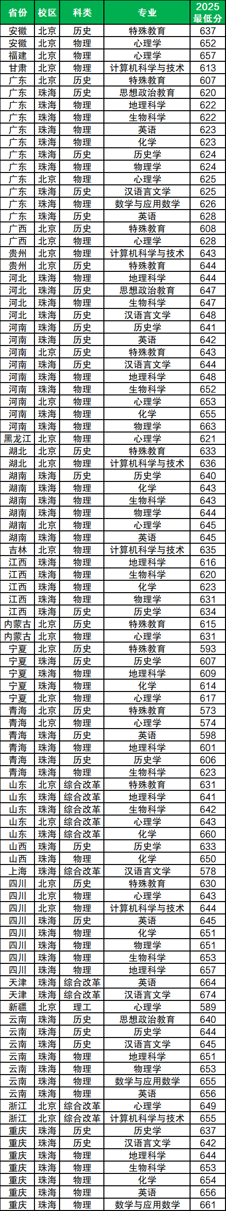 下面是北京师范大学公费师范生2025年全国各省最低分详情: