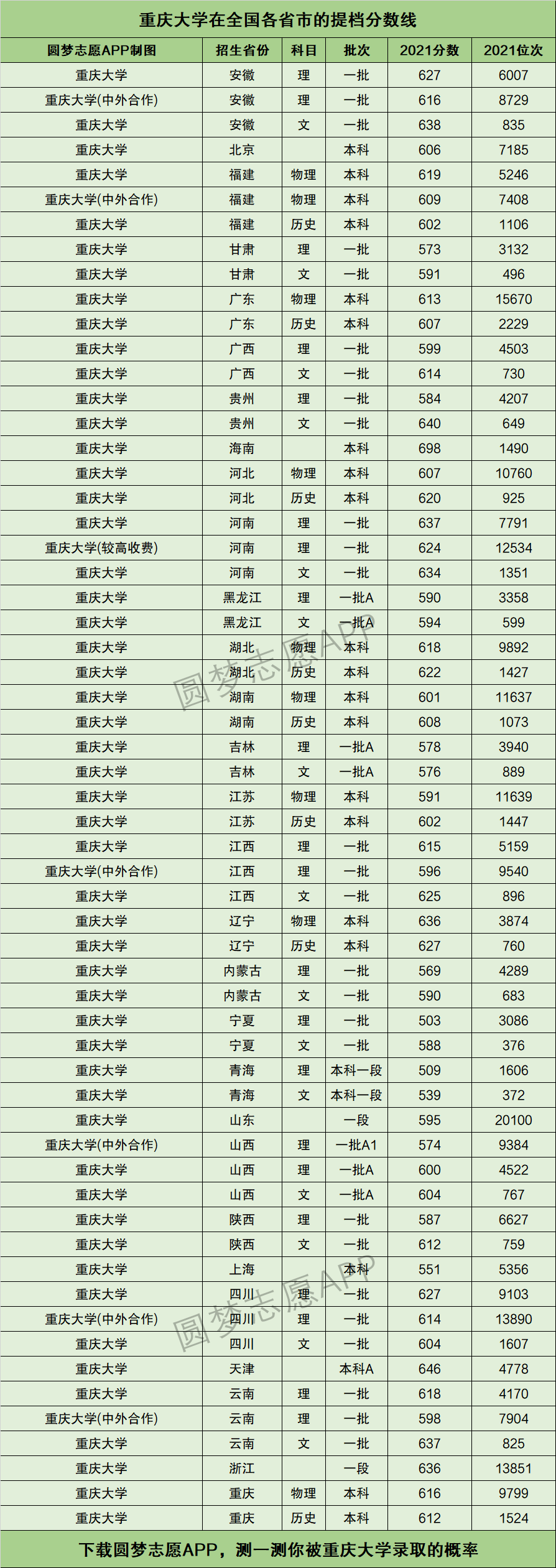 一、重庆大学提档线2021年 重庆大学位于重庆市,所以小编先为大家单独列出了重庆大学在重庆市2021年的提档分数线。 1、历史类 重庆大学在本科批的最低提档线为612分,最低位次为1524名。 2、物理类 重庆大学在本科批的最低提档线为616分,最低位次为9799名。 如果你想查看:重庆大学各专业——近三年的录取分数线和位次。请直接在手机应用市场下载圆梦志愿APP,获取资料。 二、重庆大学调档比例 本文将以重庆大学2021年本科招生章程为依据,为大家提供重庆大学的调档比例。 根据各省生源情况和学校预留计划确定调档比例,平行志愿投档的批次,调档比例原则上控制在105%以内,顺序志愿投档的批次,调档比例原则上控制在120%以内。 三、重庆大学在全国各省市的提档线汇总 下图为具体的招录数据,同学们在参考时一定不能只看重庆大学的最低分,要重点对比重庆大学的最低录取位次↓
