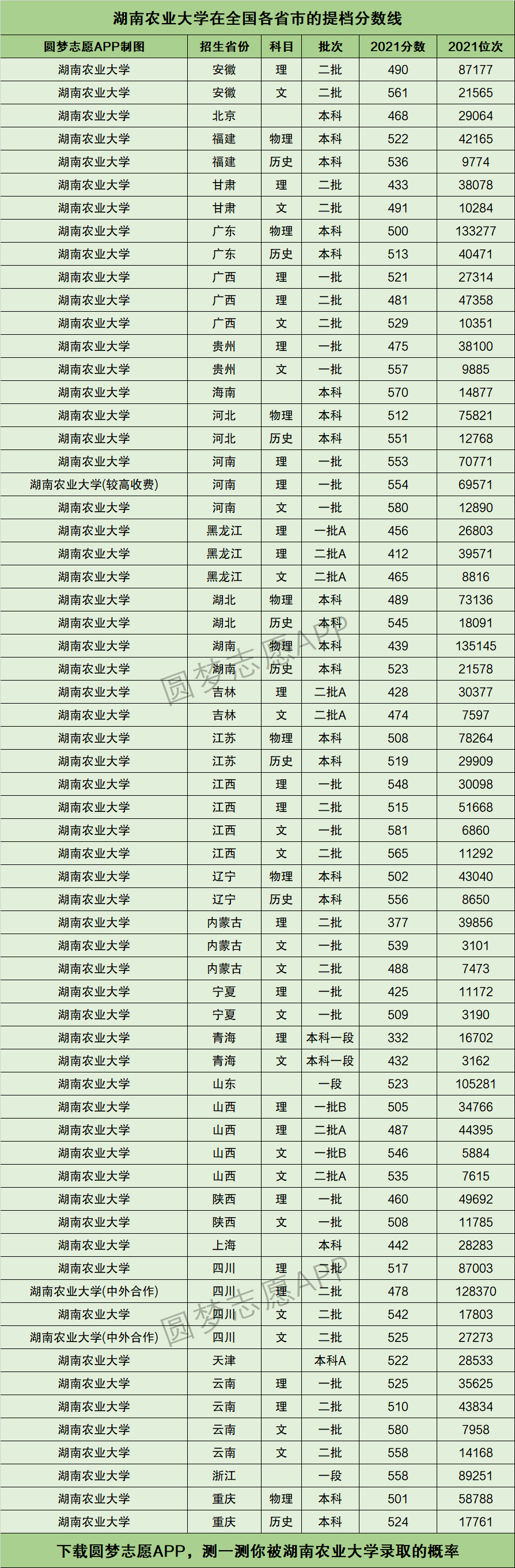 一、湖南农业大学提档线2021年 湖南农业大学位于湖南省长沙市,所以小编先为大家单独列出了湖南农业大学在湖南省2021年的提档分数线。 1、历史类 湖南农业大学在本科批的最低提档线为523分,最低位次为21578名。 2、物理类 湖南农业大学在本科批的最低提档线为439分,最低位次为135145名。 如果你想查看:湖南农业大学各专业——近三年的录取分数线和位次。请直接在手机应用市场下载圆梦志愿APP,获取资料。 二、湖南农业大学调档比例 本文将以湖南农业大学2021年本科招生章程为依据,为大家提供湖南农业大学的调档比例。 调档比例学校调阅考生档案的比例,各省均不超过102%。 三、湖南农业大学在全国各省市的提档线汇总 下图为具体的招录数据,同学们在参考时一定不能只看湖南农业大学的最低分,要重点对比湖南农业大学的最低录取位次↓