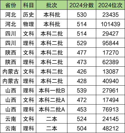 可以看到,学校对多数地区的考生而言属于二本院校,2024年录取分数线最低是514分(河北物理、四川文科),最高是539分(山西理科一本)。