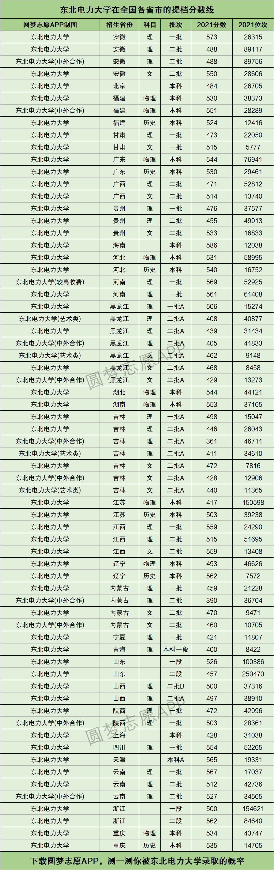 一、东北电力大学提档线2021年 东北电力大学位于吉林省,所以小编先为大家单独列出了东北电力大学在吉林省2021年的提档分数线。 1、文科 东北电力大学在本科二批A的最低提档线为472分,最低位次为7816名。 东北电力大学(中外合作)在本科二批A的最低提档线为428分,最低位次为12906名。 东北电力大学(艺术类)在本科二批A的最低提档线为440分,最低位次为11365名。 2、理科 东北电力大学在本科一批A的最低提档线为498分,最低位次为15047名。 东北电力大学在本科二批A的最低提档线为446分,最低位次为26043名。 东北电力大学(中外合作)在本科二批A的最低提档线为361分,最低位次为46711名。 东北电力大学(艺术类)在本科二批A的最低提档线为411分,最低位次为34610名。 如果你想查看:东北电力大学各专业——近三年的录取分数线和位次。请直接在手机应用市场下载圆梦志愿APP,获取资料。 二、东北电力大学调档比例 本文将以东北电力大学2021年本科招生章程为依据,为大家提供东北电力大学的调档比例。 我校根据各省(自治区、直辖市)生源情况确定投档比例,按照顺序志愿投档的批次,投档比例原则上控制在120%以内;按照平行志愿投档的批次,投档比例原则上控制在105%以内。如生源省份投档比例有特殊要求,按照生源省份投档比例要求执行。 三、东北电力大学在全国各省市的提档线汇总 下图为具体的招录数据,同学们在参考时一定不能只看东北电力大学的最低分,要重点对比东北电力大学的最低录取位次↓