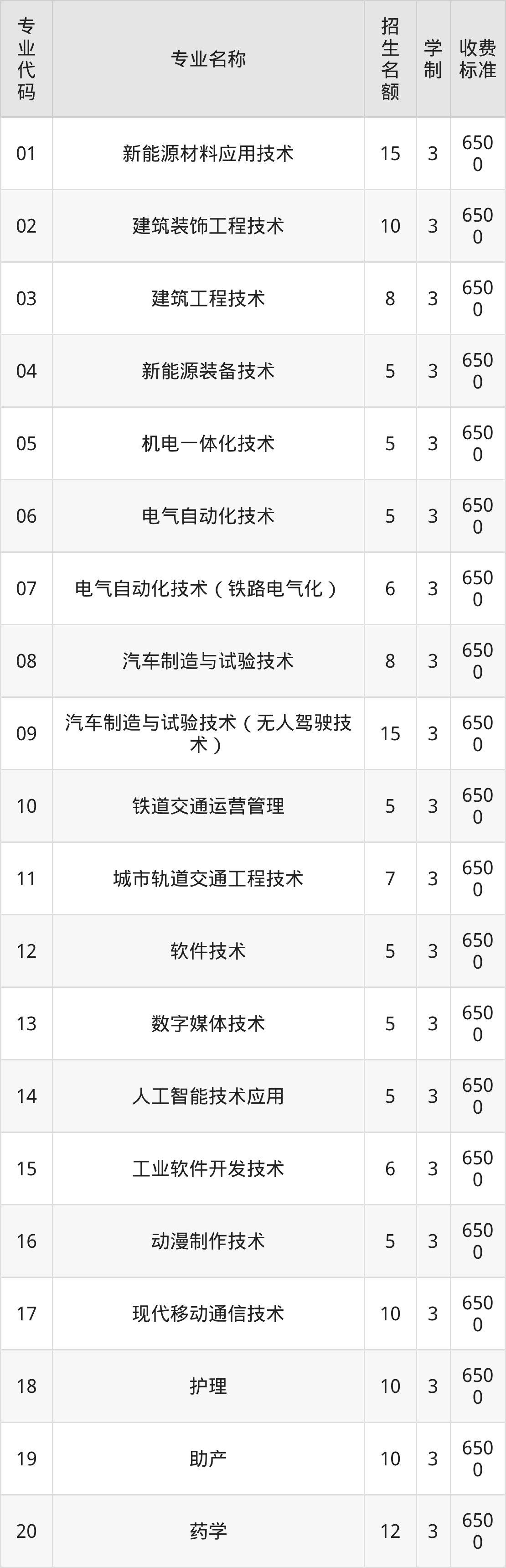 | 07 | 电气自动化技术(铁路电气化) | 6 | 3 | 6500 |