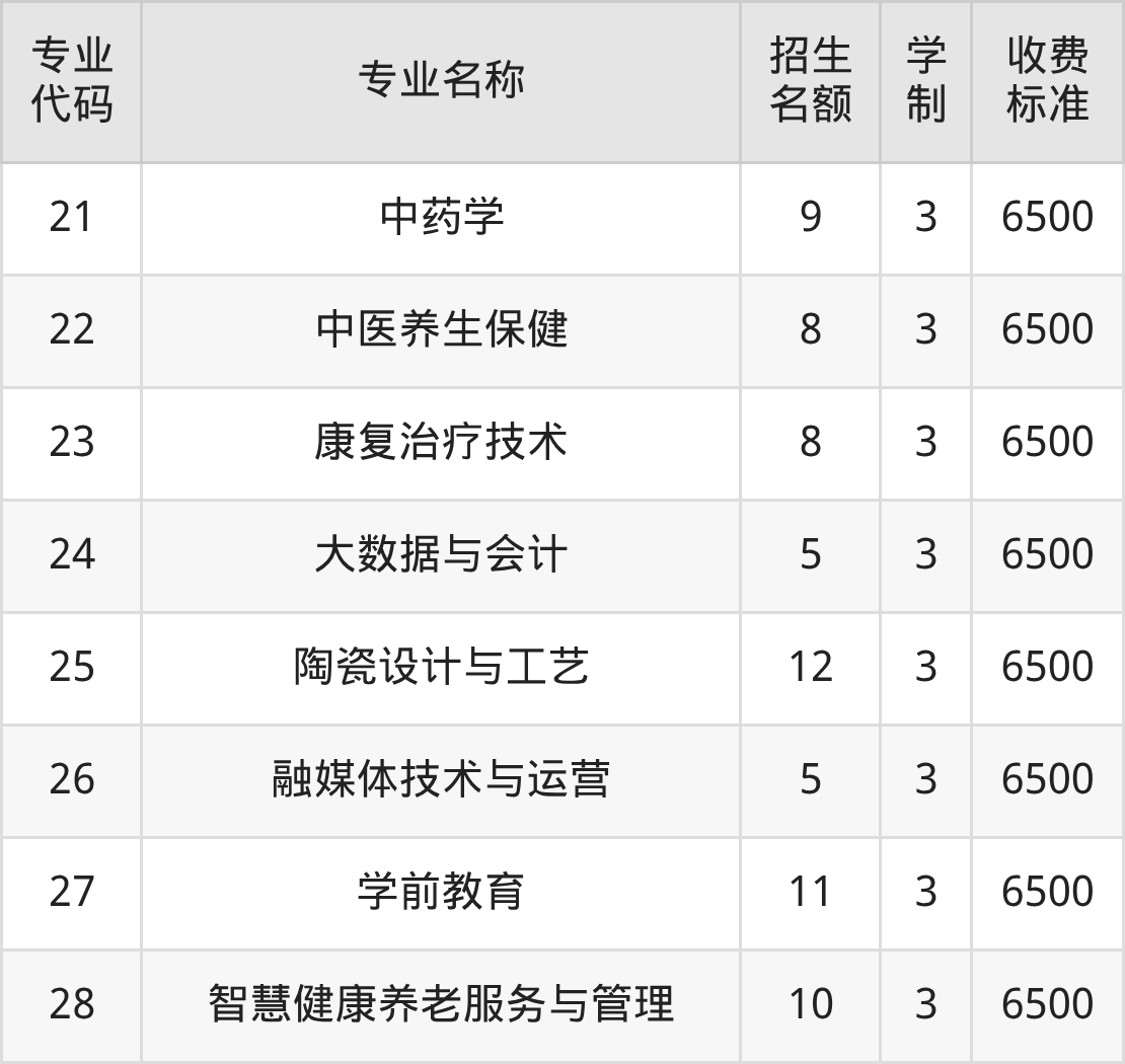| 专业 代码 | 专业名称 | 招生 名额 | 学 制 | 收费 标准 |