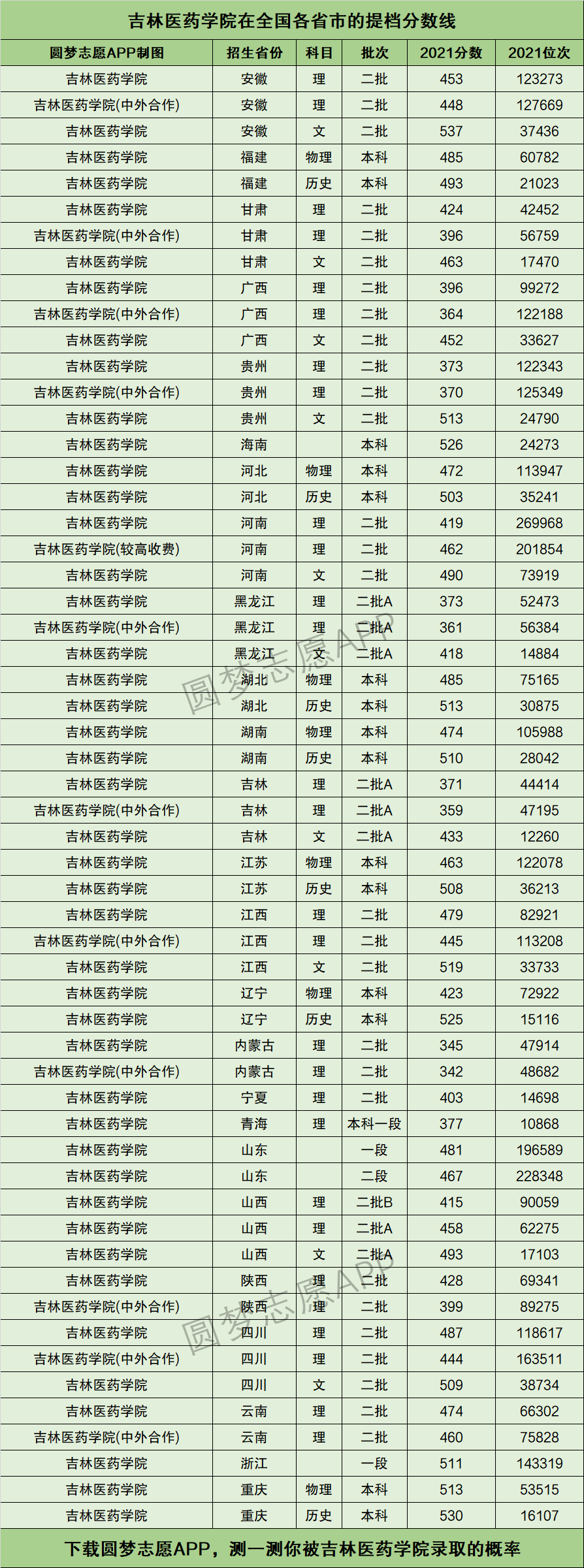 一、吉林医药学院提档线2021年 吉林医药学院位于吉林省,所以小编先为大家单独列出了吉林医药学院在吉林省2021年的提档分数线。 1、文科 吉林医药学院在本科二批A的最低提档线为433分,最低位次为12260名。 2、理科 吉林医药学院在本科二批A的最低提档线为371分,最低位次为44414名。 吉林医药学院(中外合作)在本科二批A的最低提档线为359分,最低位次为47195名。 如果你想查看:吉林医药学院各专业——近三年的录取分数线和位次。请直接在手机应用市场下载圆梦志愿APP,获取资料。 二、吉林医药学院调档比例 本文将以吉林医药学院2021年本科招生章程为依据,为大家提供吉林医药学院的调档比例。 按照顺序志愿投档的批次,调档比例原则上控制在120%以内;按照平行志愿投档的批次,调档比例原则上控制在105%以内。如生源省份调档比例有特殊要求,按照生源省份调档比例要求执行。 三、吉林医药学院在全国各省市的提档线汇总 下图为具体的招录数据,同学们在参考时一定不能只看吉林医药学院的最低分,要重点对比吉林医药学院的最低录取位次↓