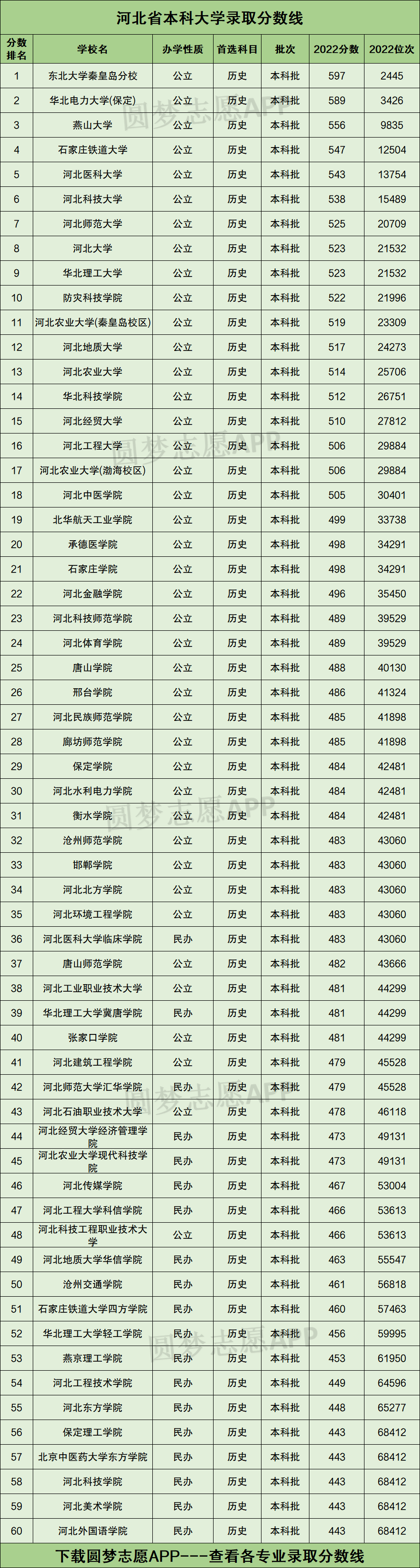 根据河北省考试院公布的数据,圆梦志愿按照历史类分数线的高低排序,为大家整理出了下图这份河北省内的所有本科大学历史类录取分数线排名榜单: