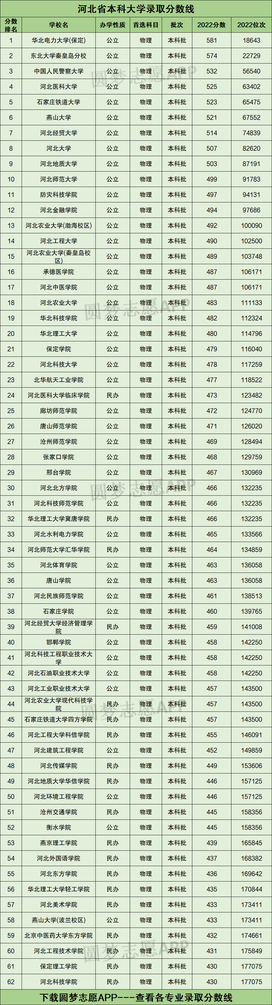 圆梦志愿根据考试院的数据,为大家整理了河北省内所有本科大学2022年高考物理类的分数线及位次排名。具体见下图: