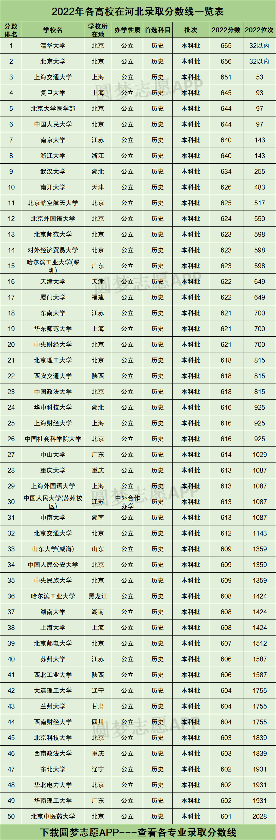 根据上图可知,2022年河北高三历史类考生,只有成绩考到了601分以上、在全省历史类考生中排名前2028名,才有机会被全国50强大学录取!