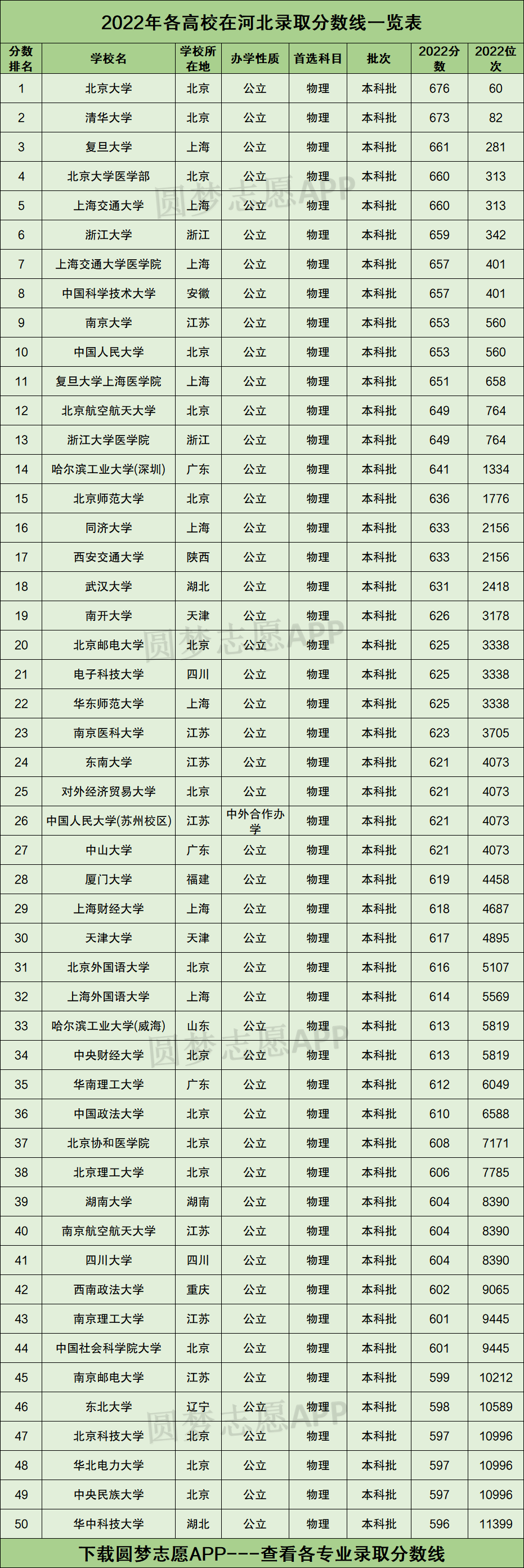 对于不想留在河北省读大学的高三同学来说,全国各地的高校在河北省的录取分数线则才是一份最有价值的参考资料。不过本文由于篇幅有限,将仅为大家展示2022年各高校在河北录取分数线最高的前50所大学,如果你想查看全国近3000所大学在河北省的录取分数线排名,可以在圆梦志愿APP中直接下载EXCEL表格。