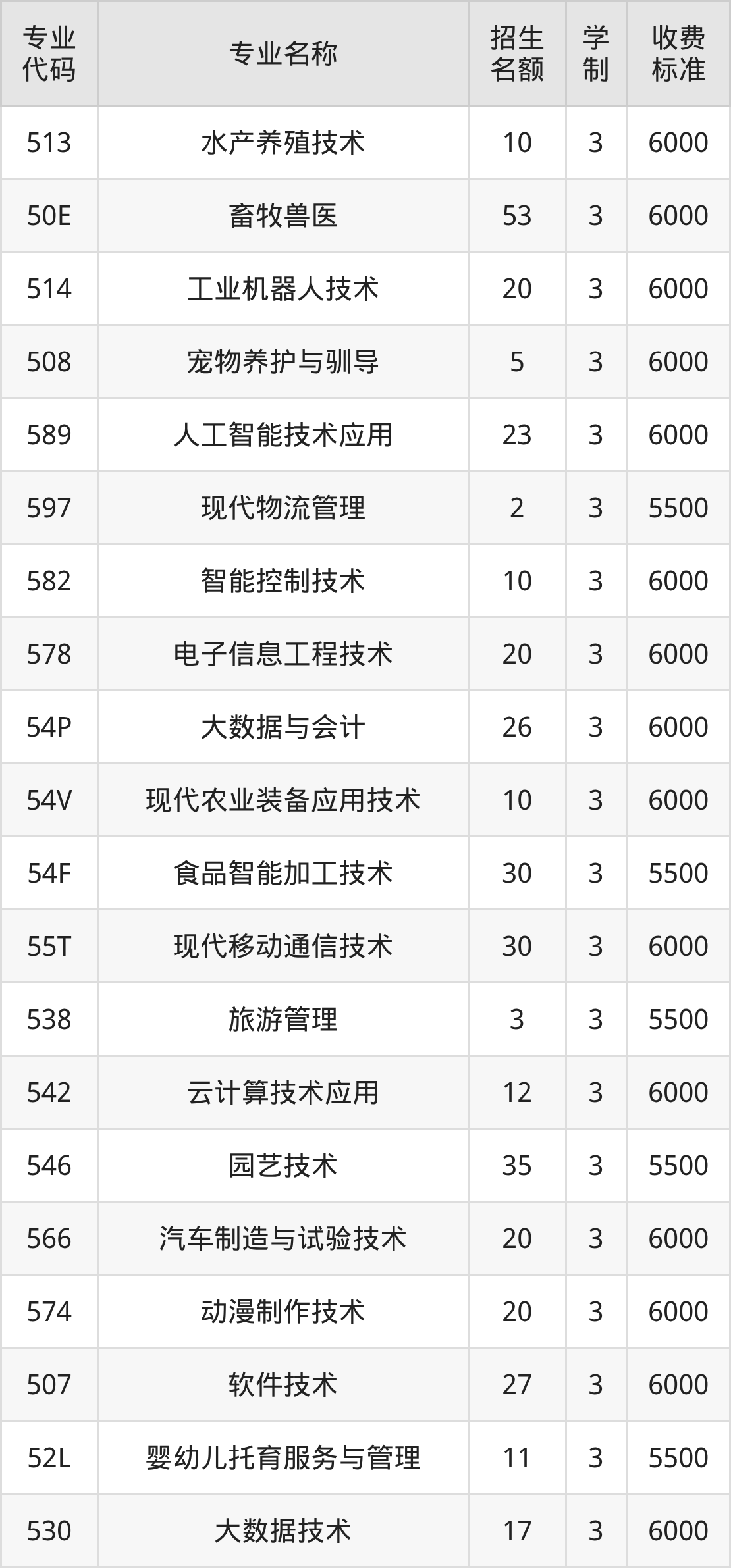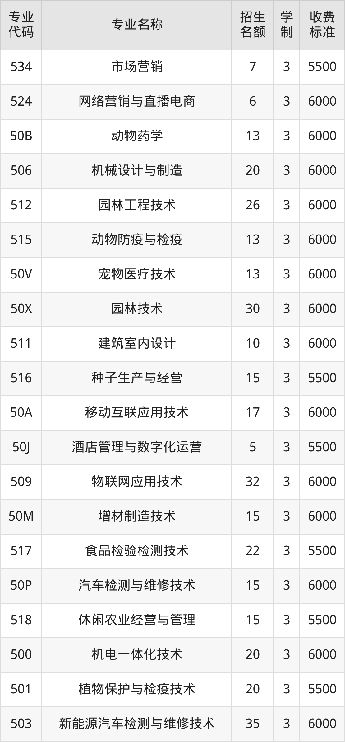 | 专业 代码 | 专业名称 | 招生 名额 | 学 制 | 收费 标准 |