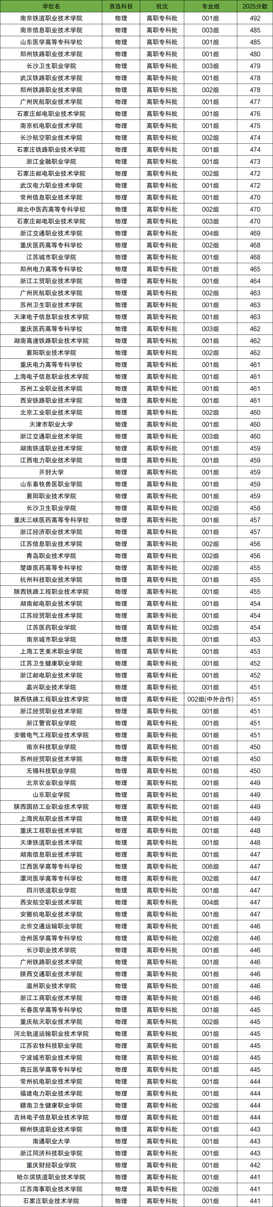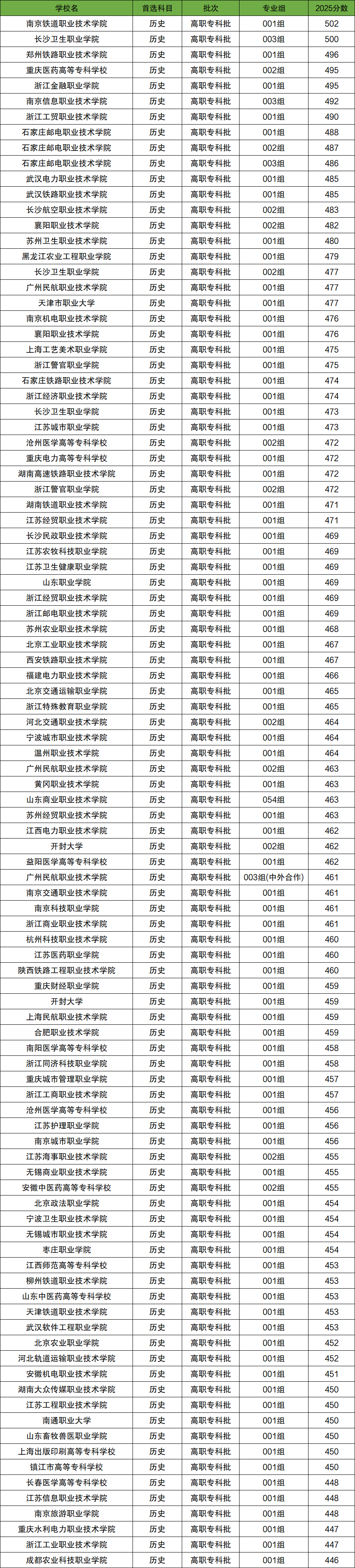 其中最低分院校为满洲里俄语职业学院,2025年最低分为201分。最高分院校为南京铁道职业技术学院,2025年最高分为502分。