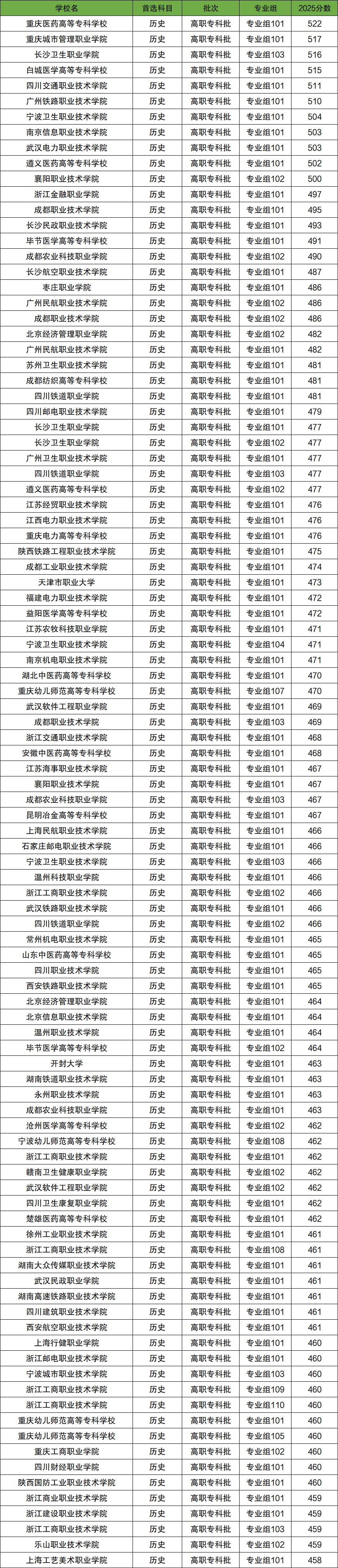 其中历史类分数最低的院校为青海农牧科技职业学院、宁夏幼儿师范高等专科学校、可克达拉职业技术学院、双河职业技术学院等,最低分均为150分。而分数最高的院校为重庆医药高等专科学校,最高分为522分。