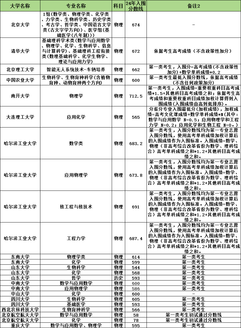 各院校强基计划在甘肃2024入围分数线: