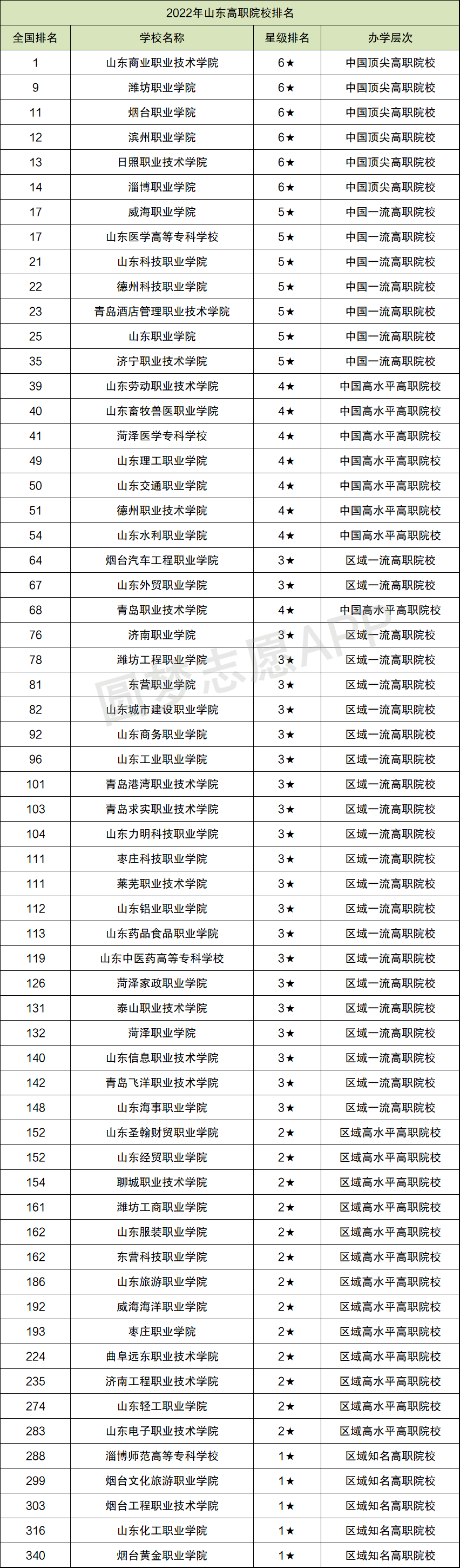 根据校友会2022年高职院校排名来看,山东入围此次榜单的高职院校一共有61所,数量是比较多的了,这也证明可供考生选择的院校也是很多的,而且进入全国前百强的高职院校一共有29所,所以山东可报考的实力较强的专业院校是非常多的。