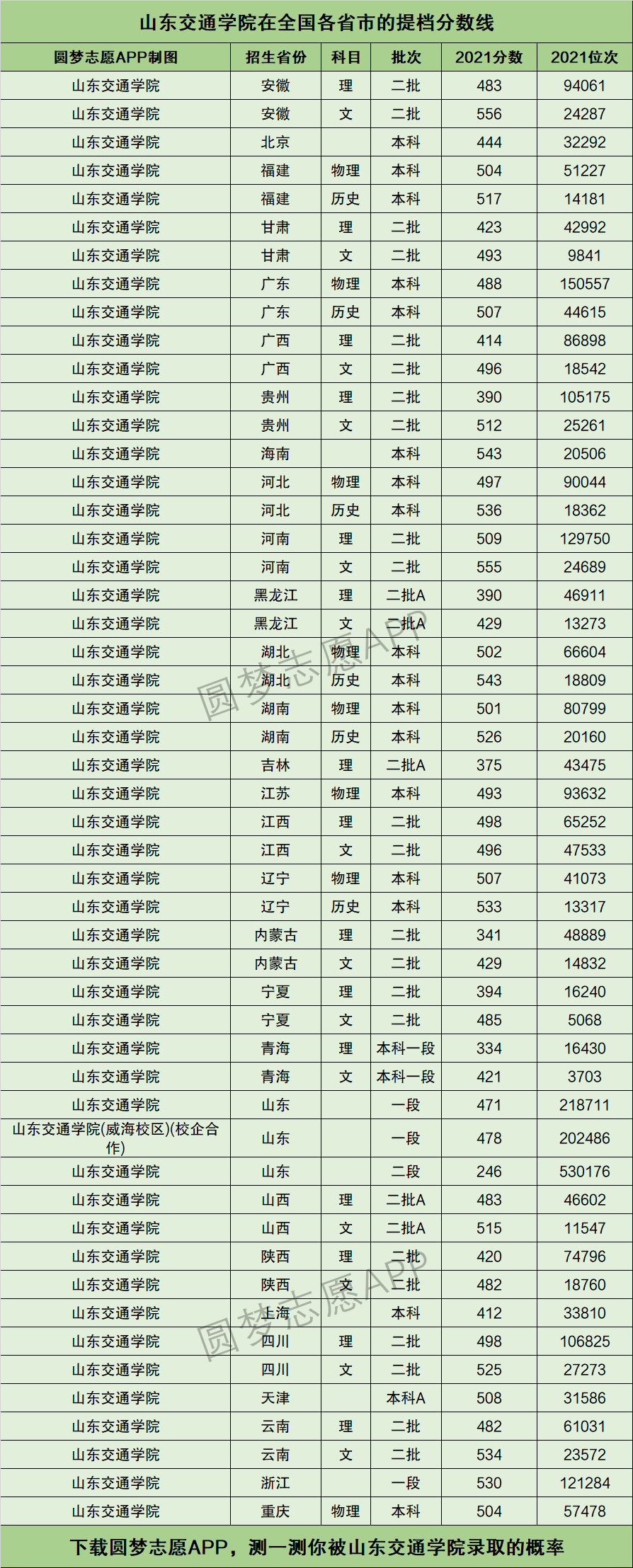 一、山东交通学院提档线2021年 山东交通学院位于山东省济南市,所以小编先为大家单独列出了山东交通学院在山东省2021年的提档分数线。 山东交通学院在本科一段的最低提档线为471分,最低位次为218711名。 山东交通学院(威海校区)(校企合作)在本科一段的最低提档线为478分,最低位次为202486名。 山东交通学院在本科二段的最低提档线为246分,最低位次为530176名。 如果你想查看:山东交通学院各专业——近三年的录取分数线和位次。请直接在手机应用市场下载圆梦志愿APP,获取资料。 二、山东交通学院调档比例 本文将以山东交通学院2021年本科招生章程为依据,为大家提供山东交通学院的调档比例。 在高考成绩达到同批次录取最低控制分数线的考生中,学校按照不超过我校在各省(自治区、直辖市)招生计划120%的比例调阅考生档案,具体比例视各省(自治区、直辖市)生源情况而定。 三、山东交通学院在全国各省市的提档线汇总 下图为具体的招录数据,同学们在参考时一定不能只看山东交通学院的最低分,要重点对比山东交通学院的最低录取位次↓