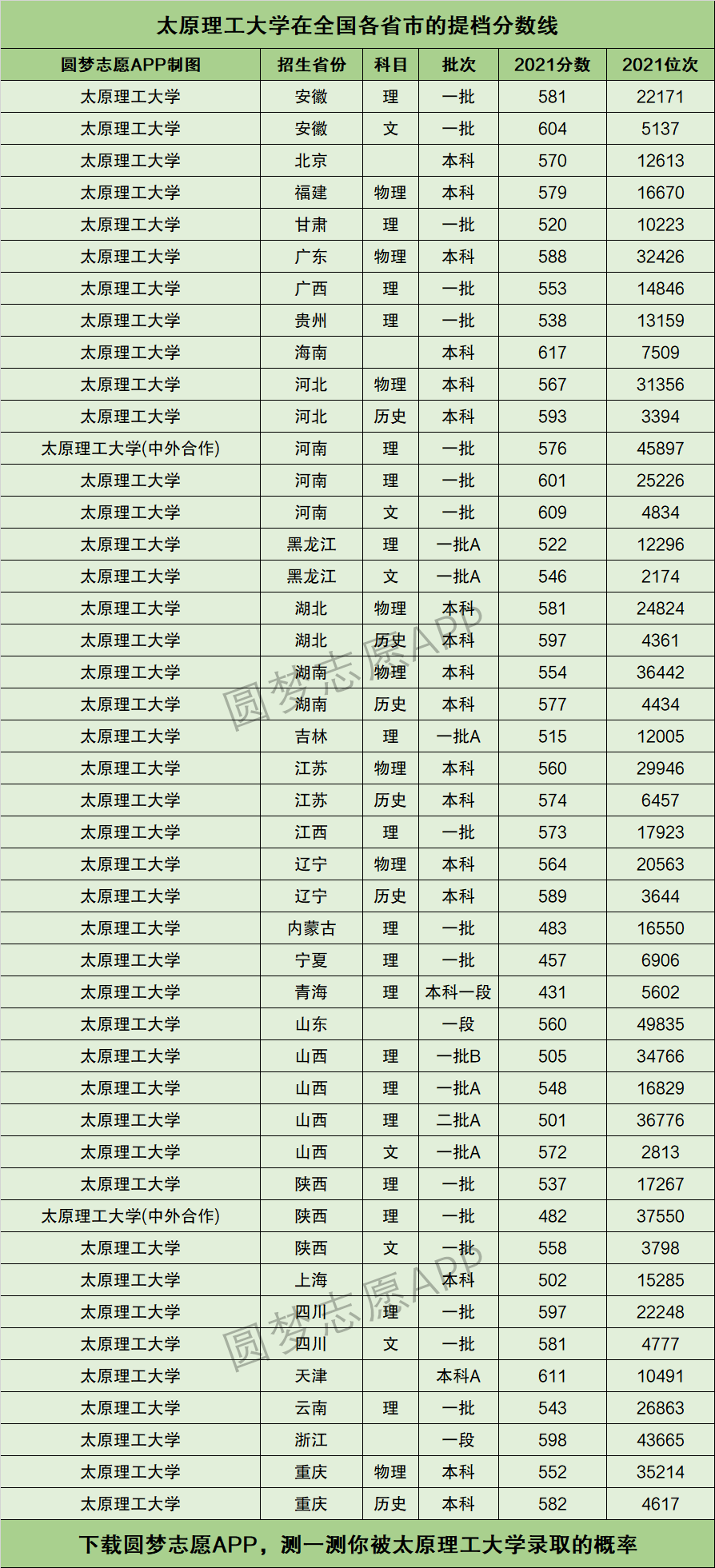 一、太原理工大学提档线2021年 太原理工大学位于山西省太原市,所以小编先为大家单独列出了太原理工大学在山西省2021年的提档分数线。 1、文科 太原理工大学在本科一批A的最低提档线为572分,最低位次为2813名。 2、理科 太原理工大学在本科一批B的最低提档线为505分,最低位次为34766名。 太原理工大学在本科一批A的最低提档线为548分,最低位次为16829名。 太原理工大学在本科二批A的最低提档线为501分,最低位次为36776名。 如果你想查看:太原理工大学各专业——近三年的录取分数线和位次。请直接在手机应用市场下载圆梦志愿APP,获取资料。 二、太原理工大学调档比例 本文将以太原理工大学2021年本科招生章程为依据,为大家提供太原理工大学的调档比例。 太原理工大学根据各省(自治区、直辖市)的招生计划和考生报志愿情况确定调档比例,调档比例一般控制在招生计划的120%以内。 三、太原理工大学在全国各省市的提档线汇总 下图为具体的招录数据,同学们在参考时一定不能只看太原理工大学的最低分,要重点对比太原理工大学的最低录取位次↓