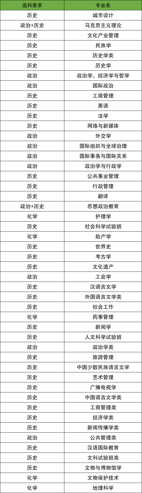 要求选科历史的专业:文化产业管理、民族学、历史学类、历史学、工商管理、英语、法学、网络与新媒体、公共事业管理、行政管理等;