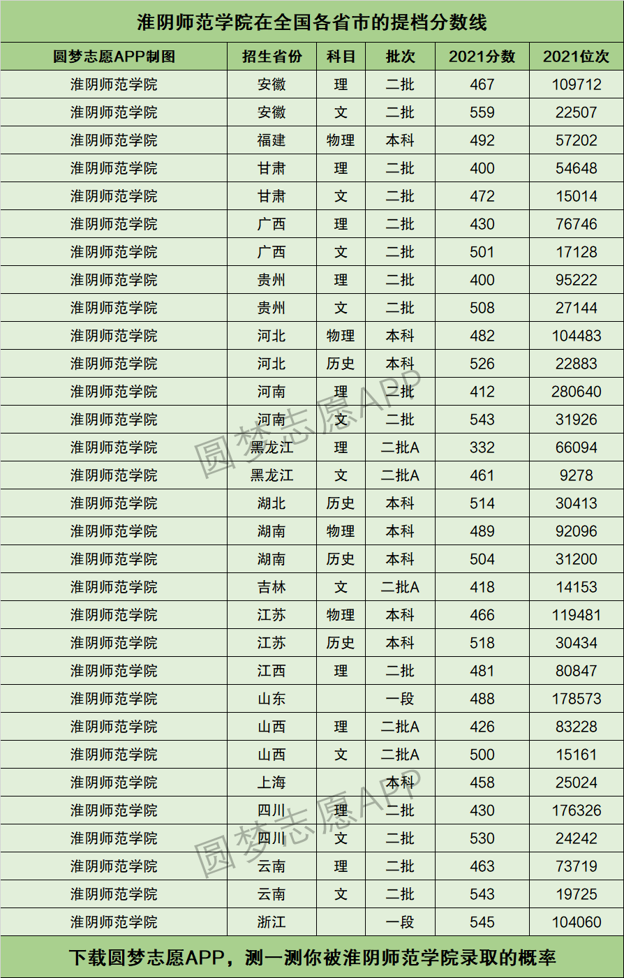 一、淮阴师范学院提档线2021年 淮阴师范学院位于江苏省淮安市,所以小编先为大家单独列出了淮阴师范学院在江苏省2021年的提档分数线。 1、历史类 淮阴师范学院在本科批的最低提档线为518分,最低位次为30434名。 2、物理类 淮阴师范学院在本科批的最低提档线为466分,最低位次为119481名。 如果你想查看:淮阴师范学院各专业——近三年的录取分数线和位次。请直接在手机应用市场下载圆梦志愿APP,获取资料。 二、淮阴师范学院调档比例 本文将以淮阴师范学院2021年本科招生章程为依据,为大家提供淮阴师范学院的调档比例。 学校根据当年生源情况,执行各省(自治区、直辖市)的有关规定确定提档比例,经教育考试院审核后,按照顺序志愿投档的批次,调档比例原则上控制在120%以内;按照平行志愿投档的批次,调档比例原则上控制在105%以内。 三、淮阴师范学院在全国各省市的提档线汇总 下图为具体的招录数据,同学们在参考时一定不能只看淮阴师范学院的最低分,要重点对比淮阴师范学院的最低录取位次↓