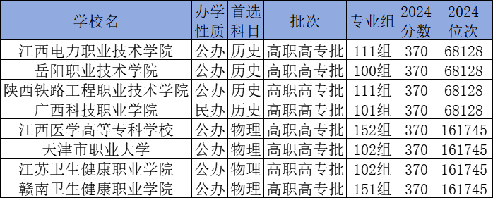 历史类370分能上的有江西电力职业技术学院、岳阳职业技术学院、陕西铁路工程职业技术学院、广西科技职业学院;物理类370分能上的有江西医学高等专科学校、天津市职业大学、江苏卫生健康职业学院等。