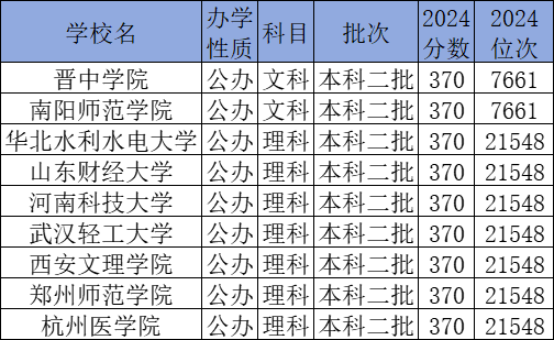 文科370分能上的大学有晋中学院、南阳师范学院;理科370分能上的大学有华北水利水电大学、山东财经大学、河南科技大学、武汉轻工大学等。